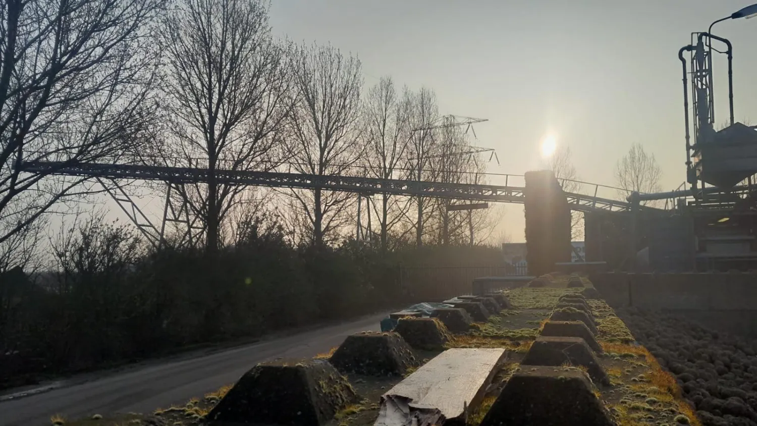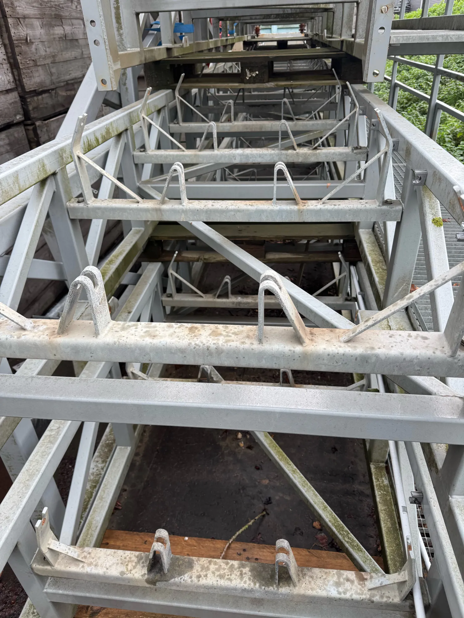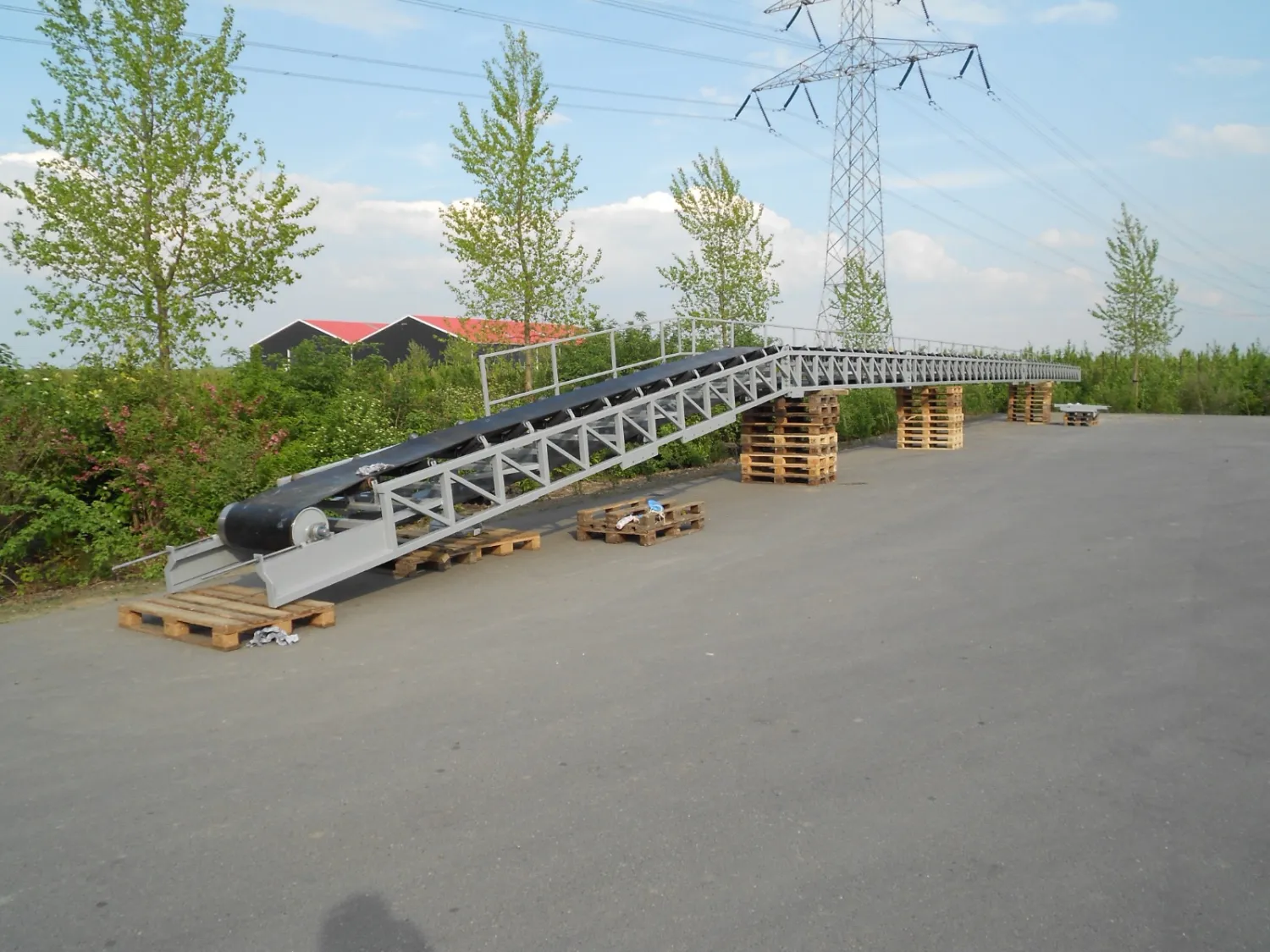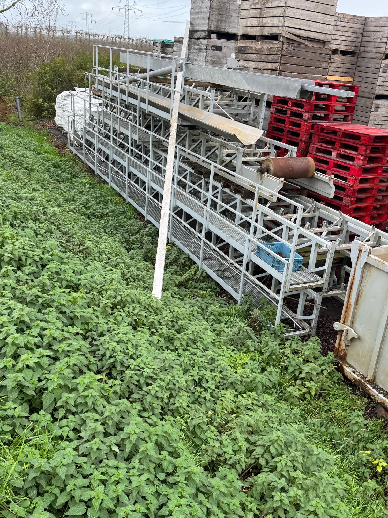 Transport band _+ 35 meter lang en 65 cm breed . Is frame met alle rollen . En poten om op te voeren en aan 1 kant een loopbordes . Is zonder rubberen band .