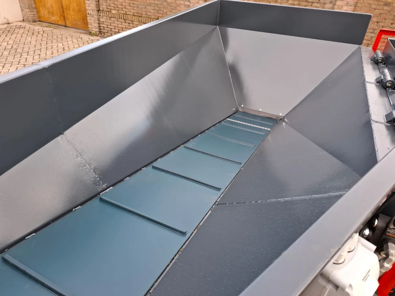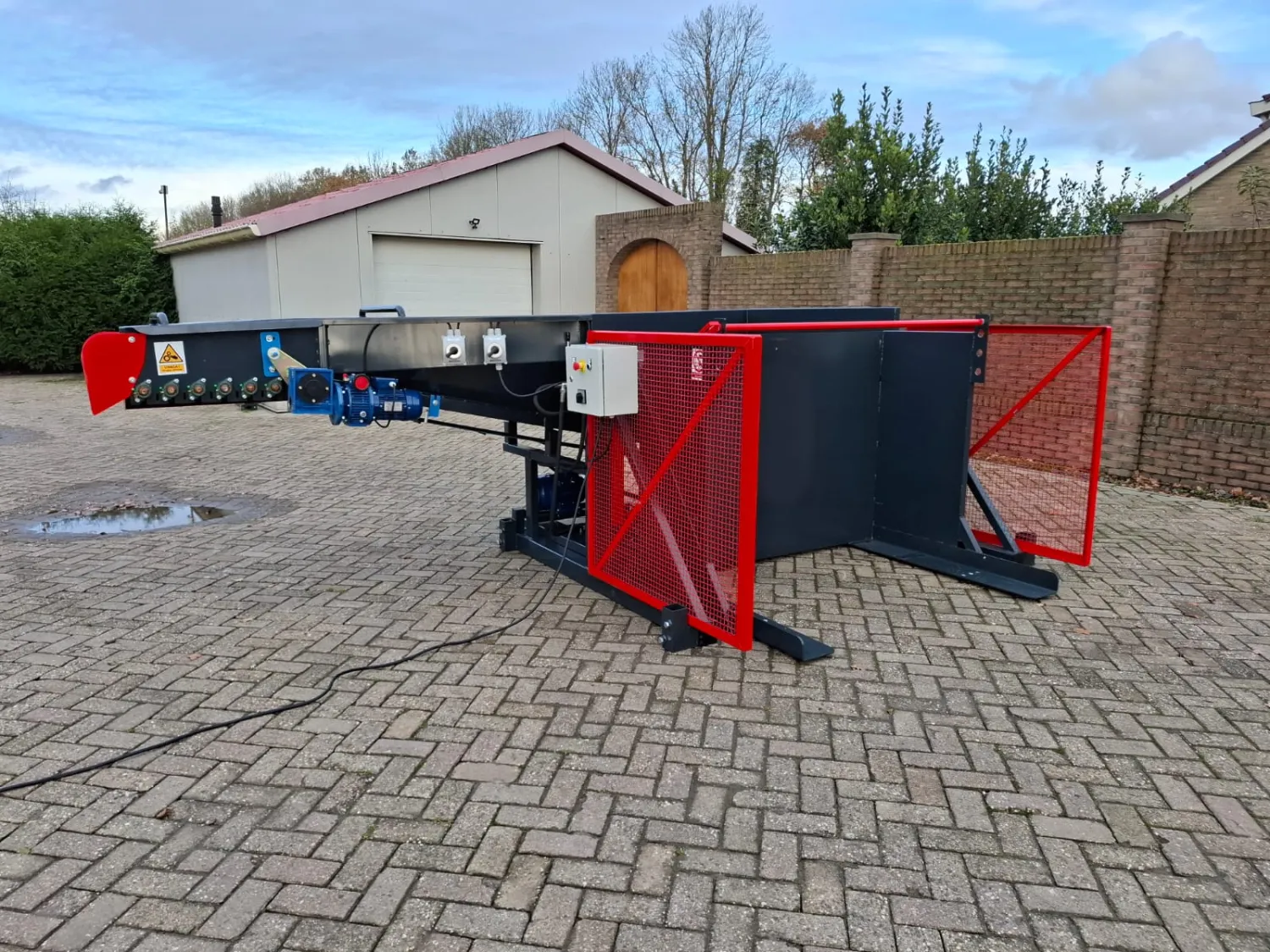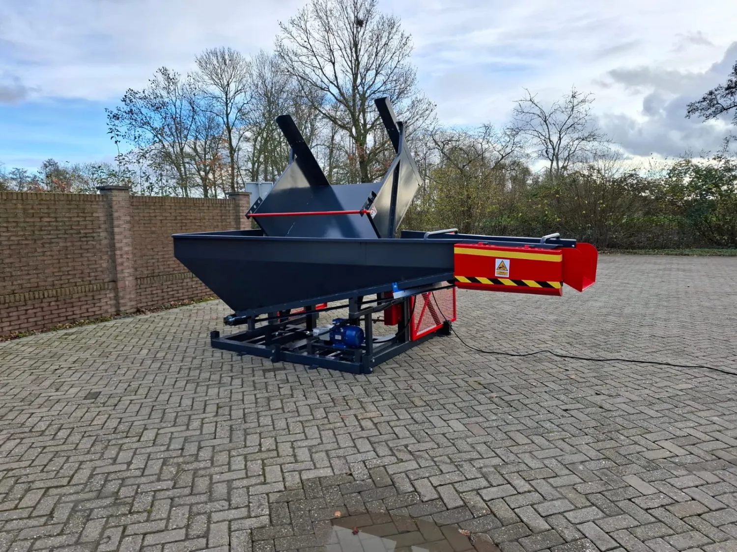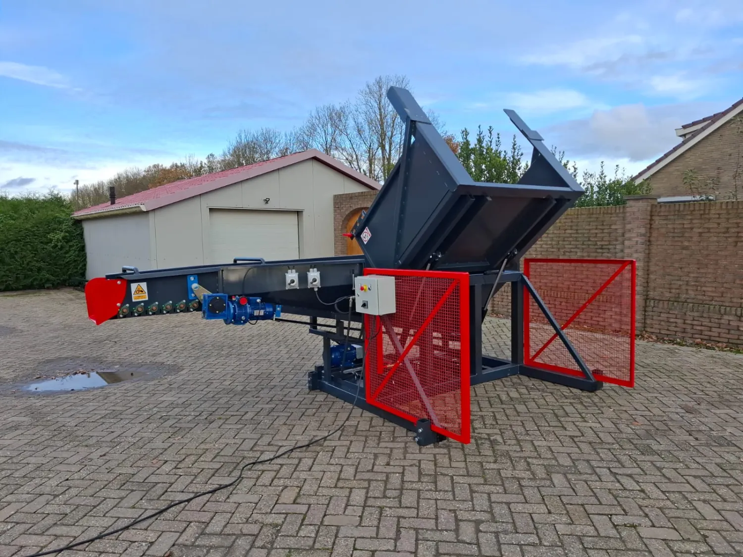 Volcador de cajas - Nuevo volcador de cajas - Depósito eléctrico/hidráulico con cinta transportadora - Juego de rodillos para eliminar la tierra suelta del producto - Cinta transportadora/juego de rodillos con velocidad regulable mediante variador manual - Precio: 8500 € (IVA no incluido)