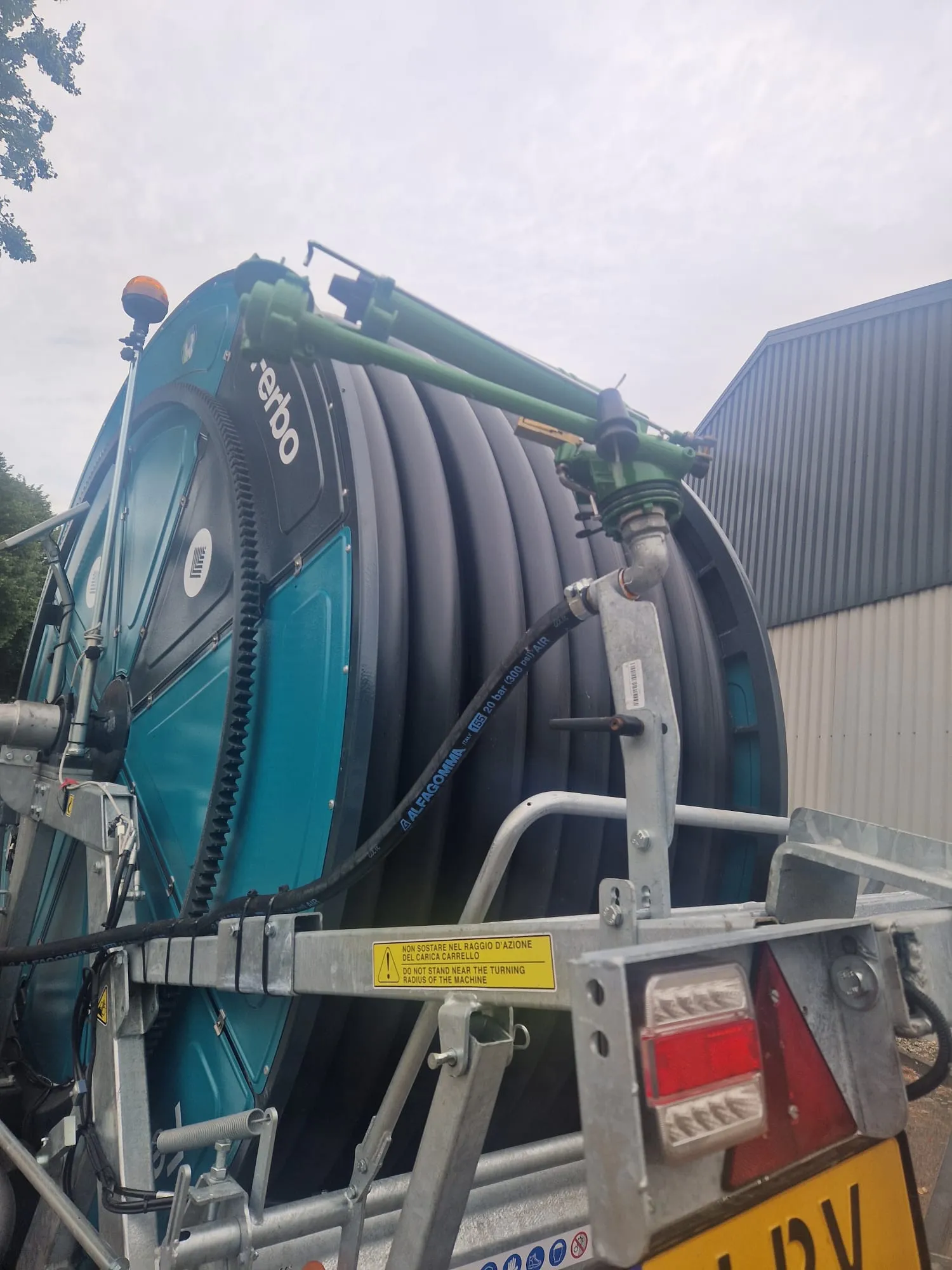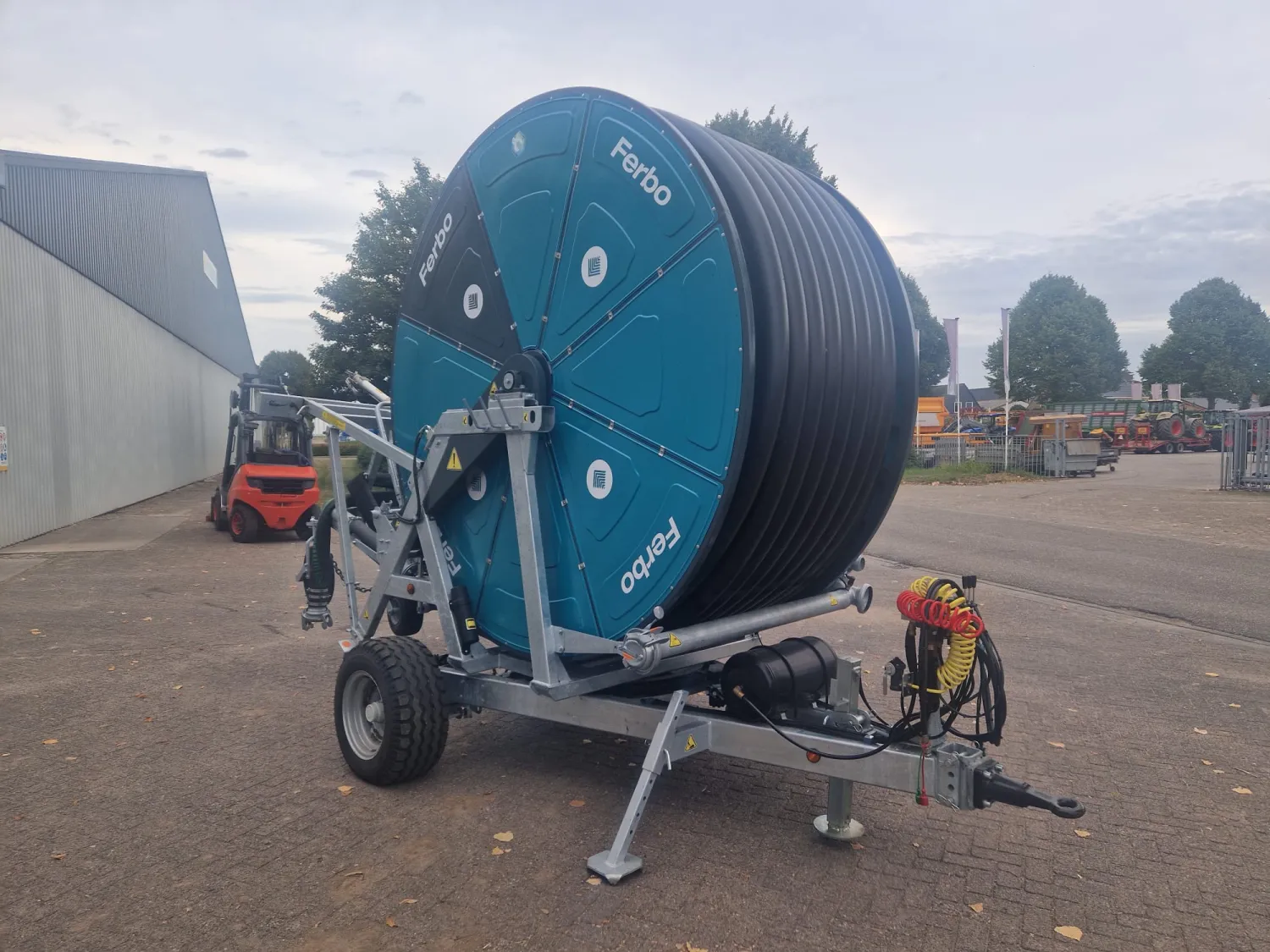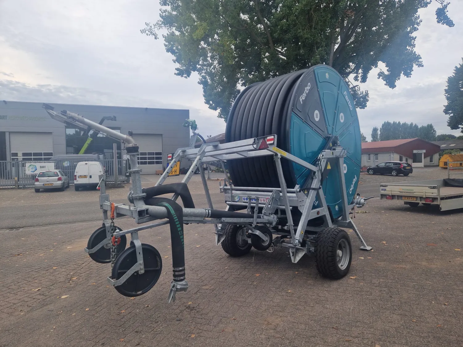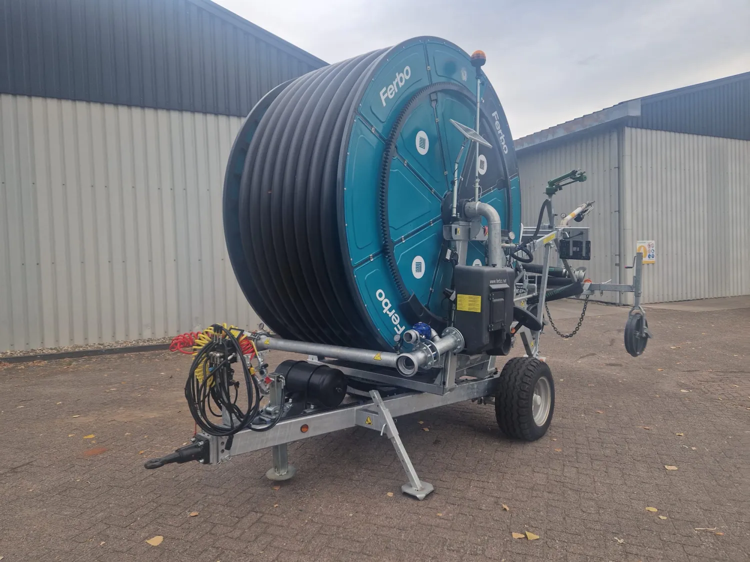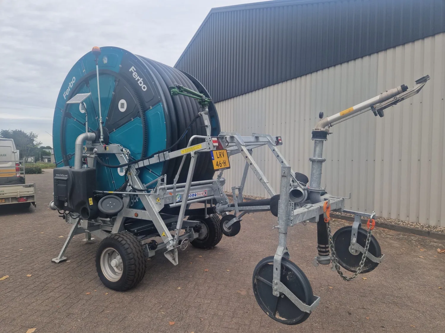 Ferbo GDs 120-350 Bouwjaar: 2025 Slanglengte: 350 meter Slangdiameter: 120 mm Geheel gegalvaniseerd frame & drum Drum in kleur Tandwielkast met 4 versnellingen Sime Explorer kanon incl. 3 nozzles Dubbele invoer 4 meter persslang incl. Bauer 133 vaderdeel koppelingen Mogelijkheid voor opwinden met de aftakas Handwiel 2'' Afblaasklep (afslag op drukverlaging) Irrigamatic EVO 1 incl. zonnepaneel Led-zwaailamp GSM module t.b.v. EVO computer Hydraulische sproeiwagenlift, draaien & steunpoot Enkelas onderstel incl. banden 40 cm breed EU homologatie tandem (luchtremmen & led-verlichting) Versteksproeiwagen GDs (rechts) met stalen wielen Kopakkerset d.m.v. elektrische kraan & skipper sproeier Timerset t.b.v. kopakkerset
