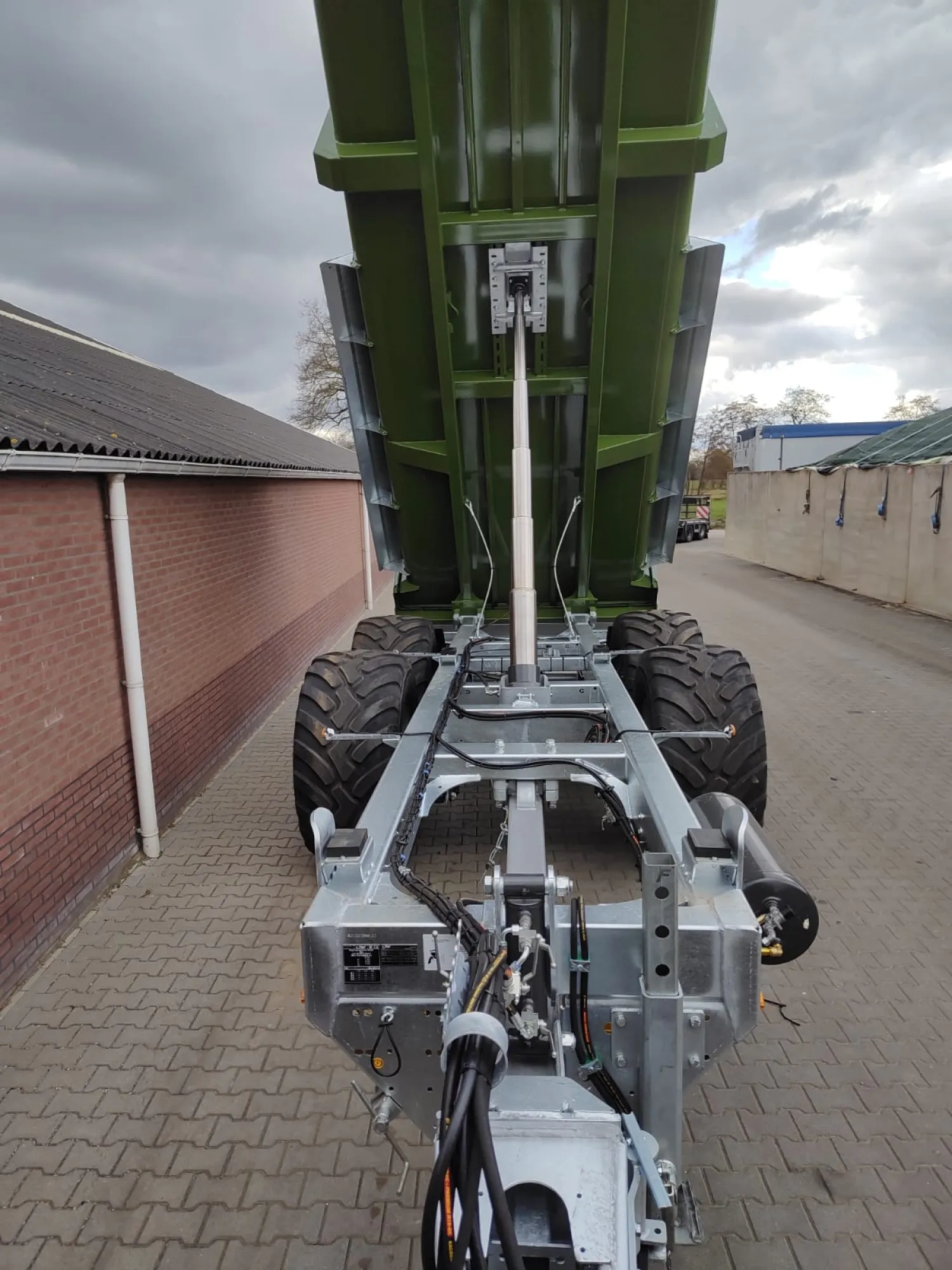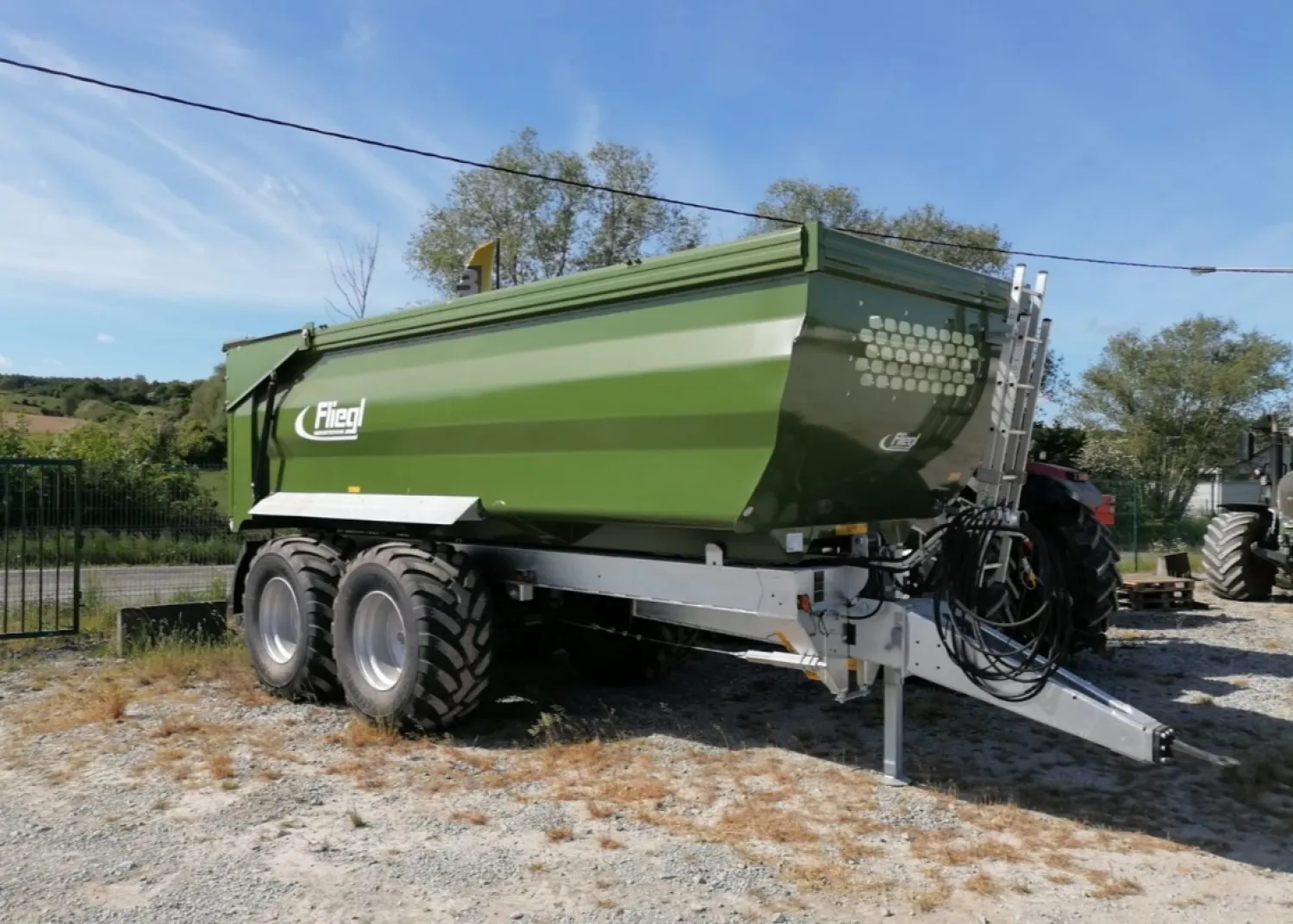 Fliegl tmk264 Bouwjaar 2026 21 tons gegalvaniseerd onderstel Bakmaat 6.4x2.32x1.5 tapslopend Staaldikte bak 4mm Hydraulisch geveerde dissel Hydraulische achterklep met graanluik Banden 600/55R26.5 Luchtremmen last afhankelijk Dynamische led verlichting Prijs is €32950ex btw Voor meer info ☎️