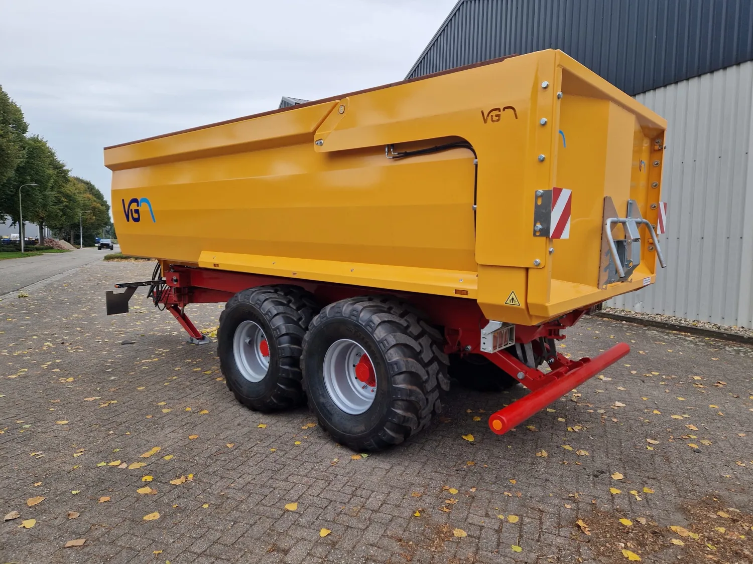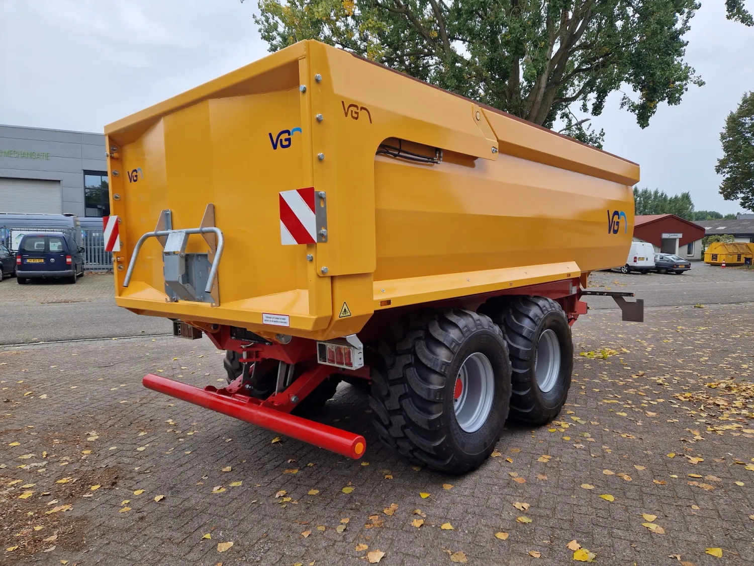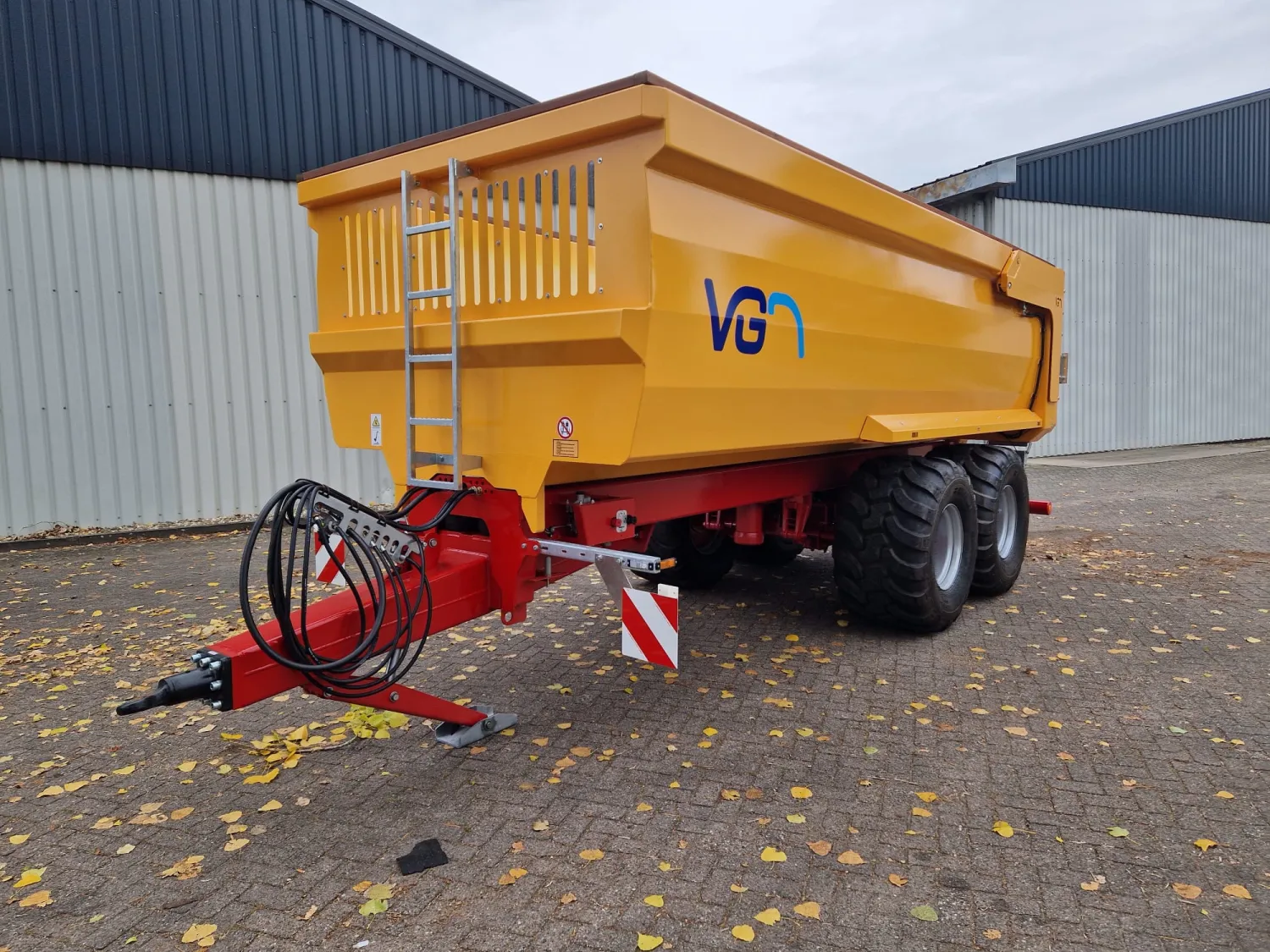 VGM HS16 landbouwkiepwagen - Bouwjaar: 2024 - Laadvermogen: 16 ton - Alliance 650/50 R22,5 banden - 10 gaats assen 130 mm (406 x 120) - Hydraulische steunpoot, vanaf trekker bediend - Taps lopende bak, daardoor beter lossend - Vier wielen geremd - Combiboosters gemonteerd, lucht en hydraulisch geremd - Doorkijkrooster in de bak - Graanschuif in de achterklep - Omtrekverlichting - LED-verlichting - Draaibaar trekoog - Slangensteun op de dissel - Rubber geveerde trekboom - Geschroefde spatborden aan de laadbak - Bakafmeting: 6000 uitw. x 2340 inw. x 1400 inw. - Kipcilinder gemonteerd in cardanische ophanging - Spoorbreedte: 1950 mm - Vetnippels van de hoofdas centraal - Blad geveerd onderstel - Vaste bumper achterop - Trap voorop de bak - Hardhouten rand - LED-werklamp voor in bak