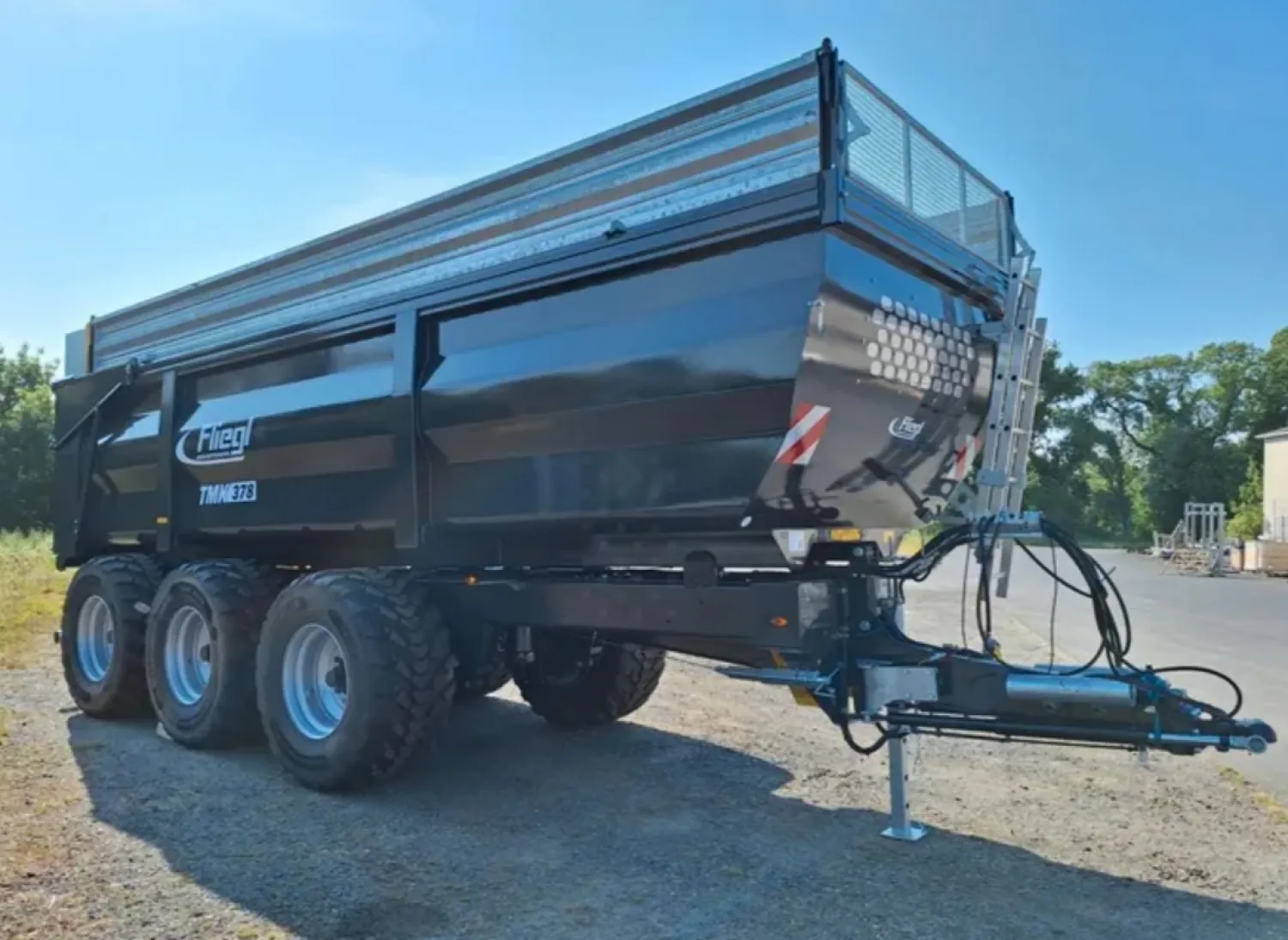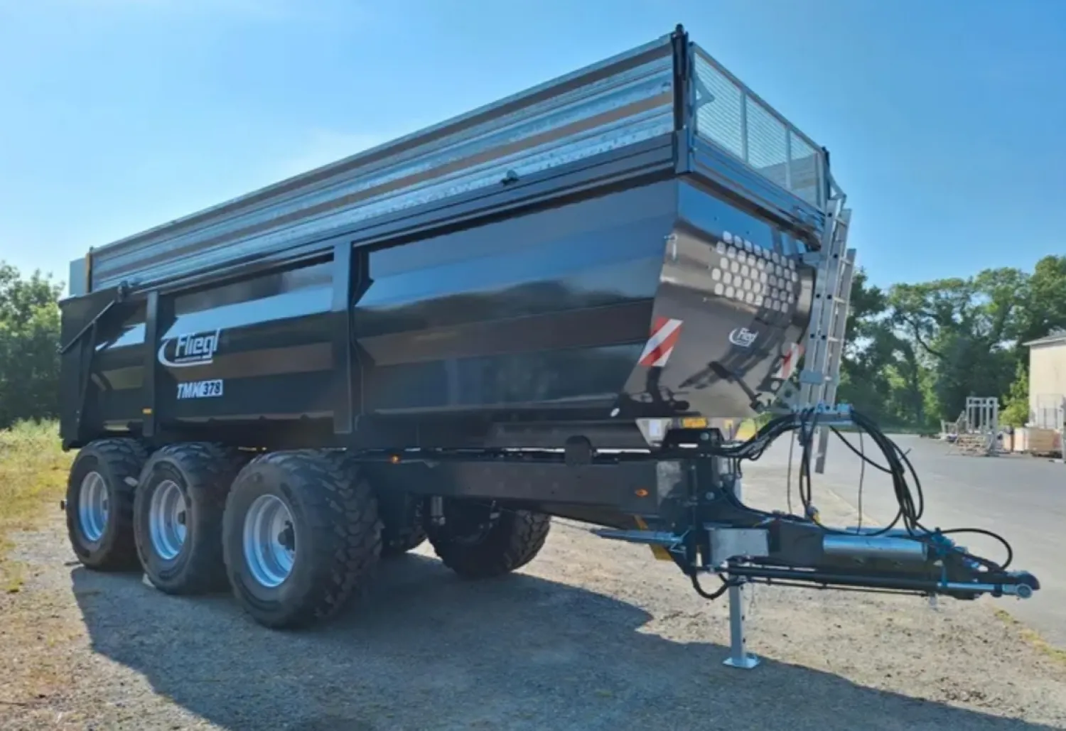 Fliegl tmk378 kipper KOMT BINNEN!!! Bouwjaar 2026 31 tons onderstel Gedwongen besturing op as 1 en 3 Hydraulisch geveerde dissel Hydraulische achterklep met graanluik Banden 710/55R26.5 Bakmaat zonder silageschotten 7.8x2.4x1.75 Parabool vering gigant plus K80 K50 Dynamische led verlichting NL kenteken Evt met silageschotten 50cm of 80cm