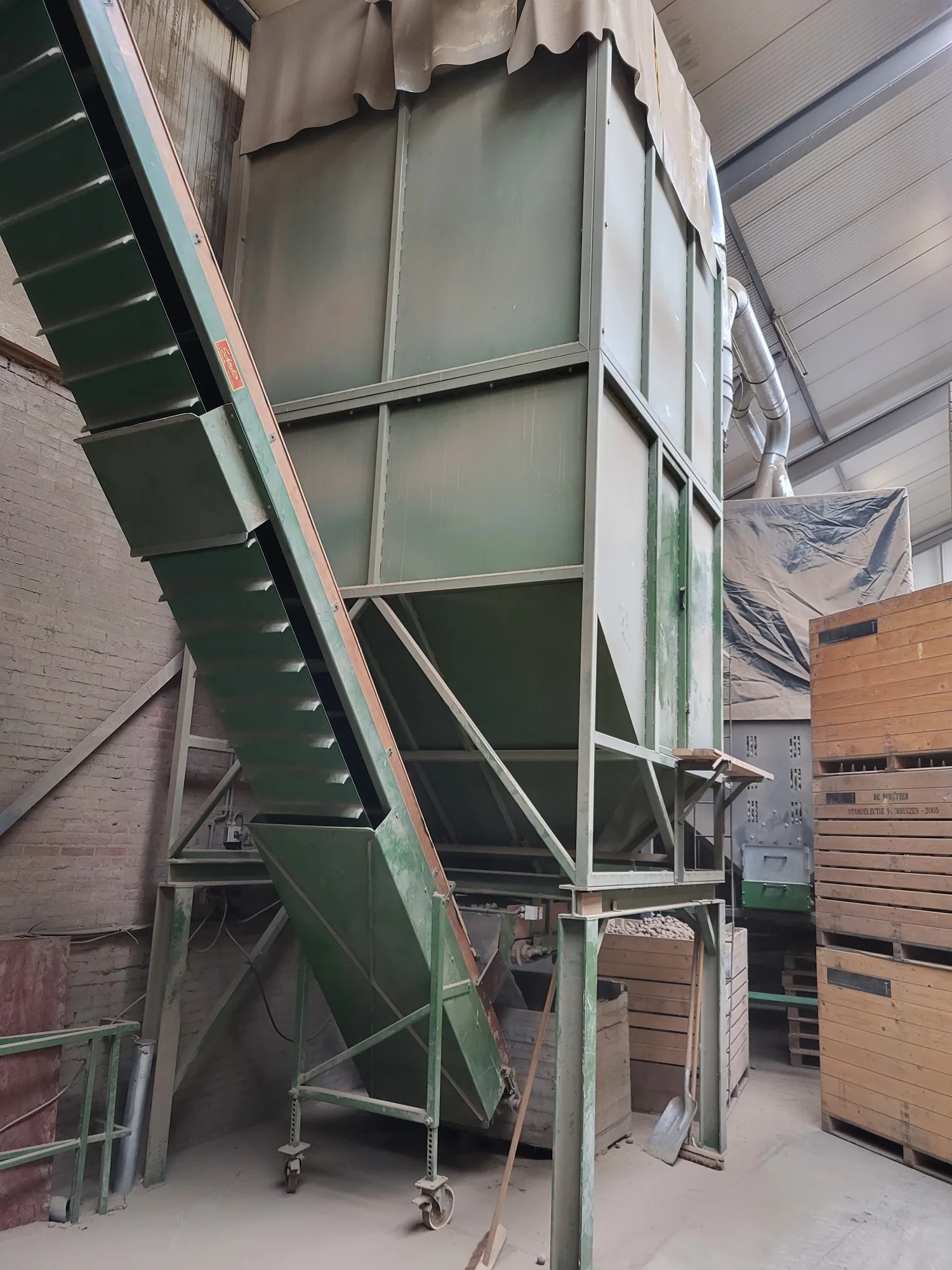 Schouten bunker 15 ton - 2.60 x 2.60 x 6.50 - lost met spijlenband - hoogte verstelbare klep - drukontlasting driehoek - goede Dijkstra valbreker toren