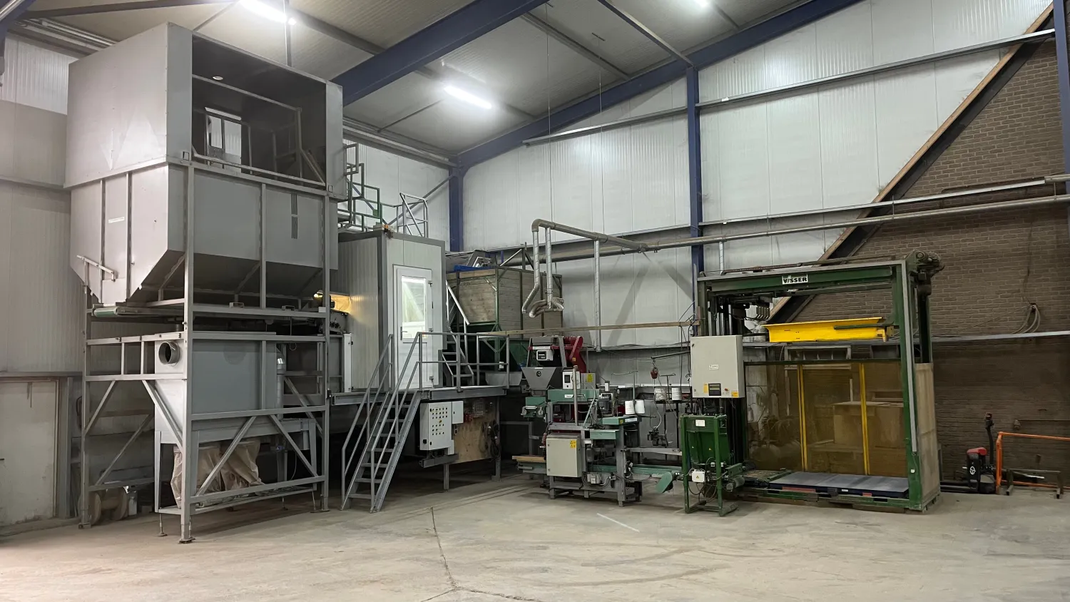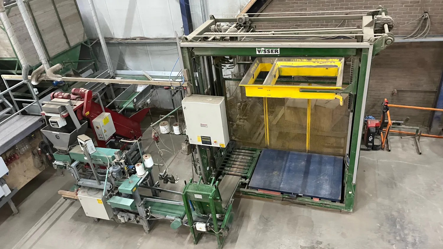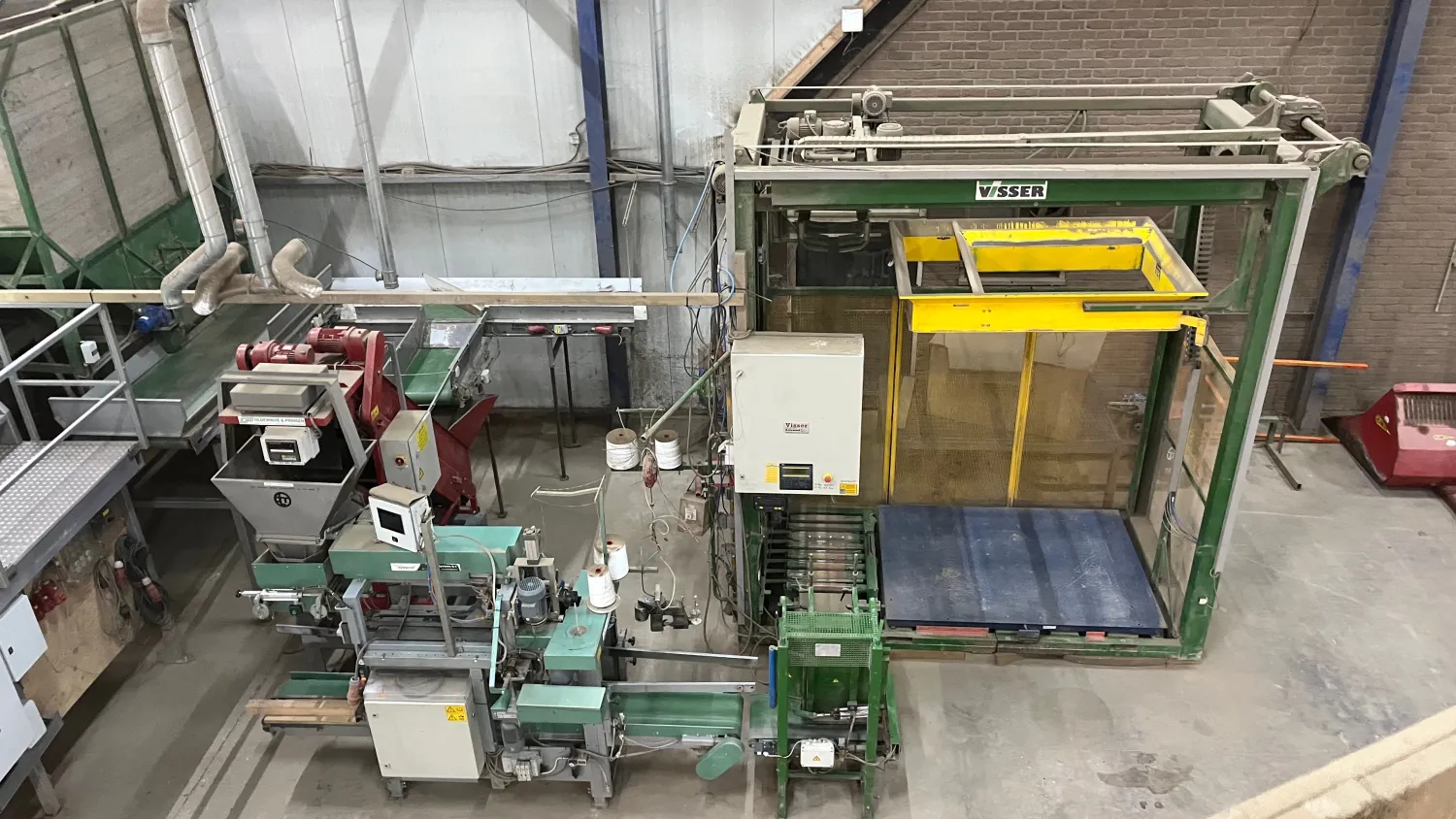 Inpak lijn compleet Bunker met Kistenkantelaar Onderlosband Rollenset Schouten Leeskamer met stofband Alles frequentie geregeld Opvoerband naar bunker Bunker met onderlosband Transport banden naar de afweger of Bbv Deligni afweger digitaal Propak Naaistraat met frequentie regelaars Visser afschoppen Visser Palletiseerder Met weger Jongejans afzuiger