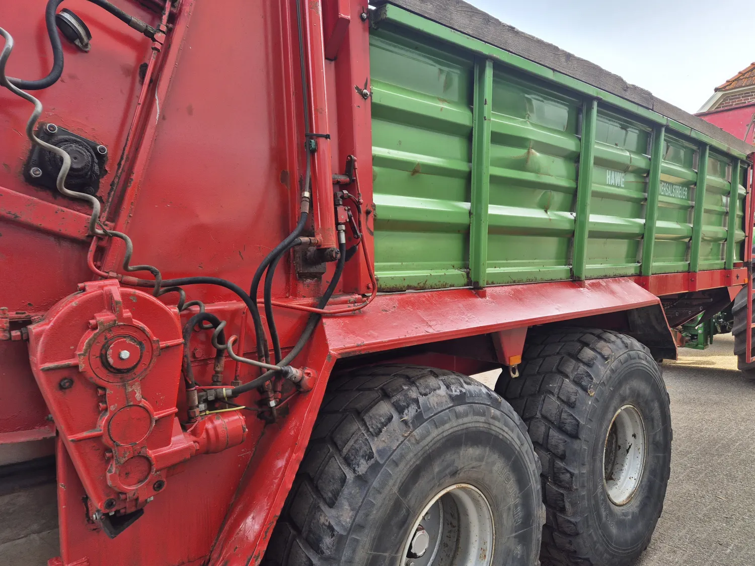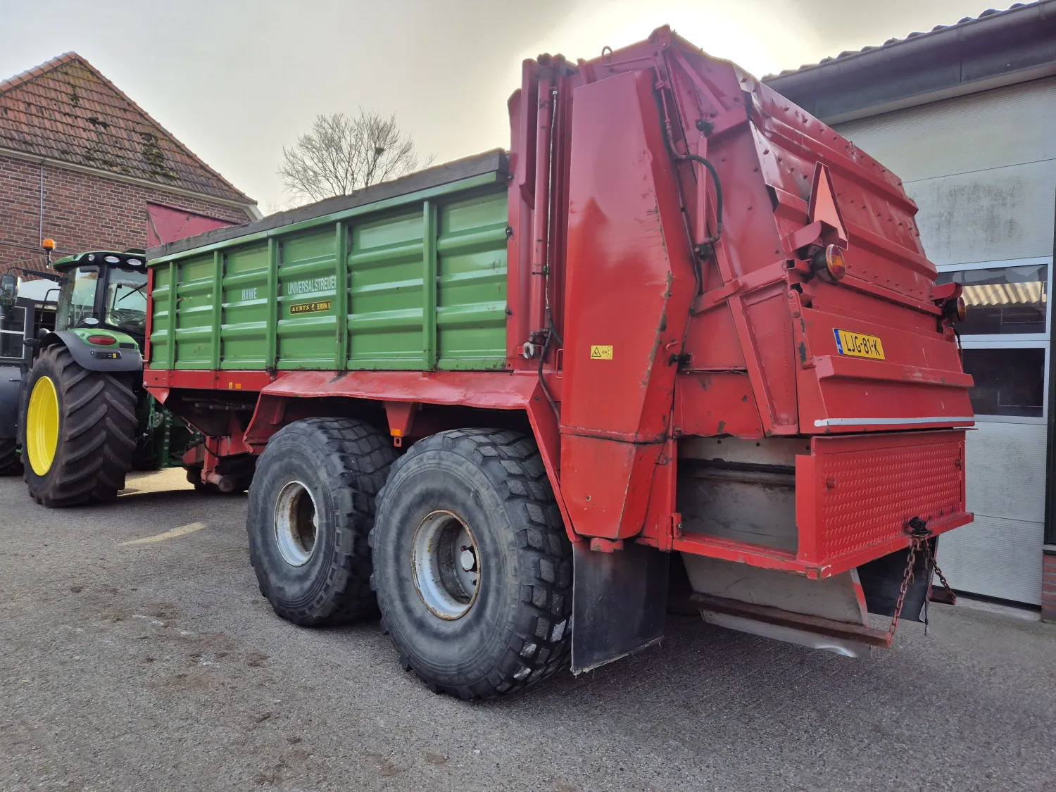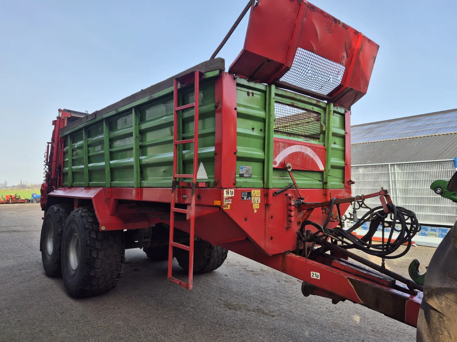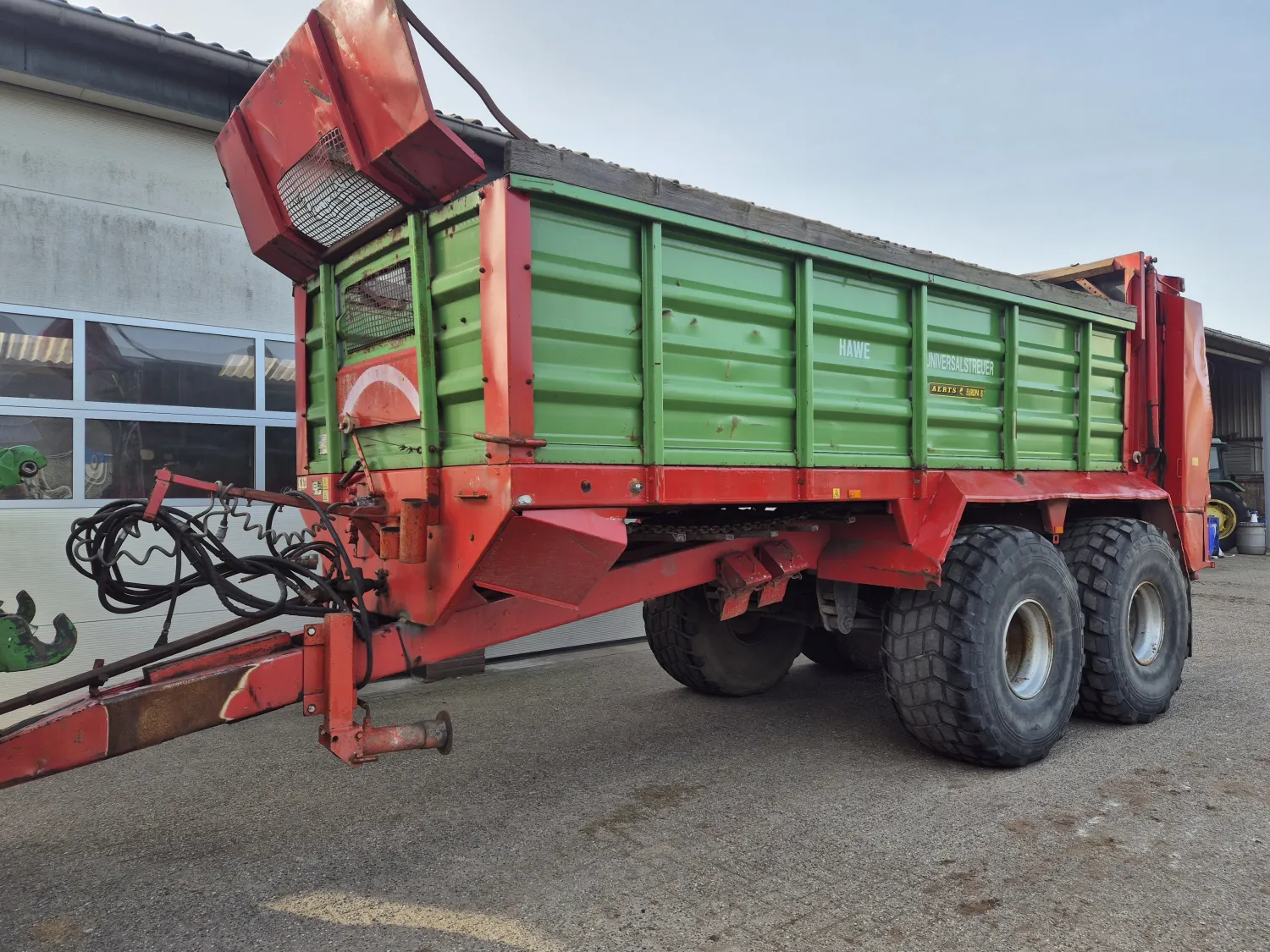 Hawe DST 16 stal meststrooier. Laatste jaren gebruikt om stro op bedden te strooien. Trechter kan eenvoudig gedemonteerd worden