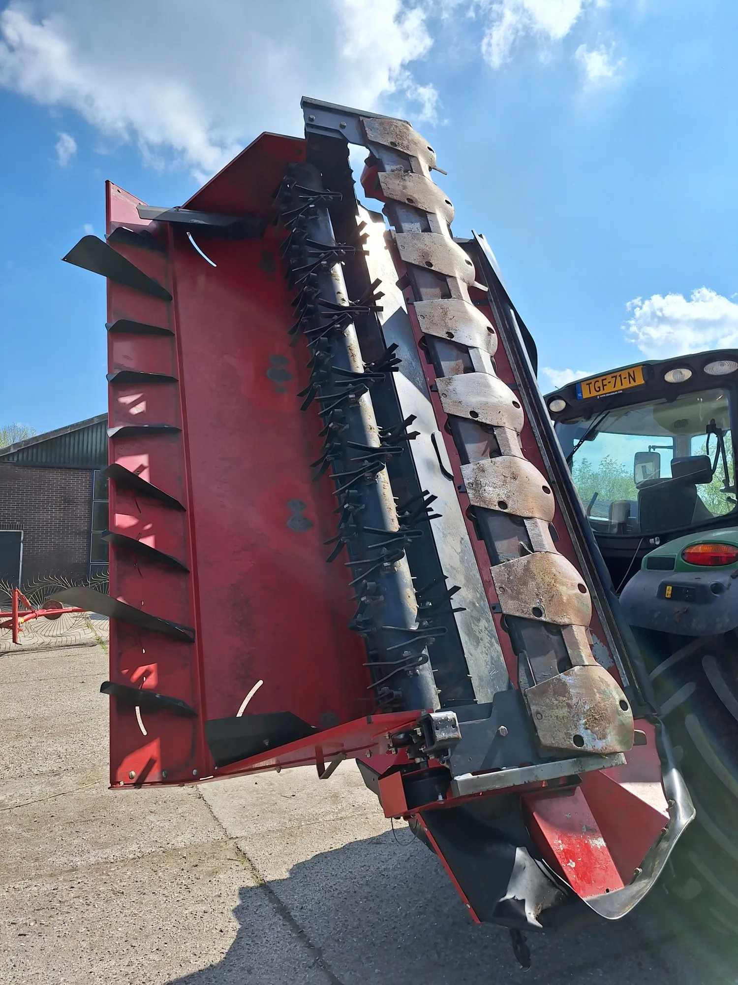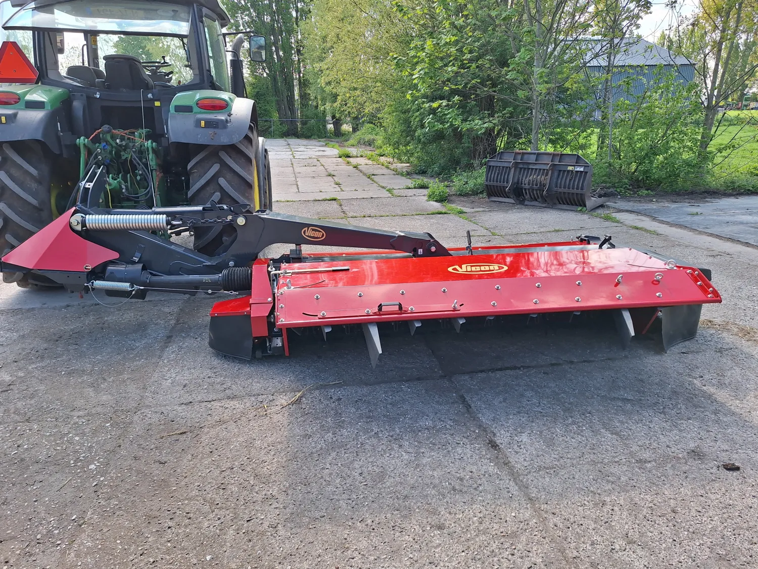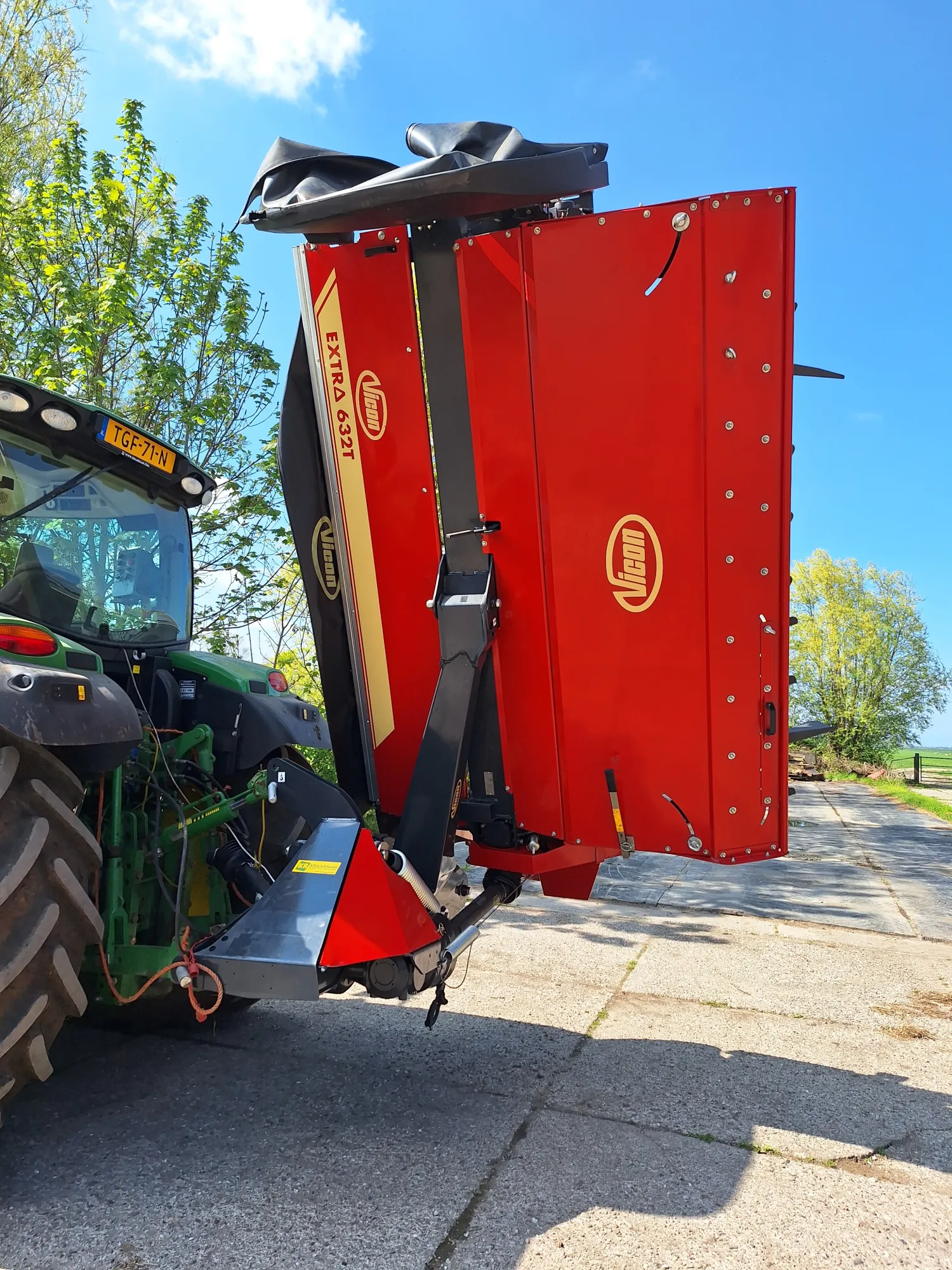 Vicon extra 632T farmer maaier - Werkbreedte 320 cm. - 8 schijven met 3 messen per schijf. - Snelwisselsysteem op de messen. - Brede kneuzer voor breedspreiden of zwadmaaien. - Kneuzer toerental eenvoudig te wijzigen 600-900 tpm. - Bodemontlastingsveer. - Transport stand van 125 graden voor gelijkmatige belasting hefarmen. Bouwjaar 2023 September '23 in gebruik genomen. 2025 niet meer gebruikt ivm beëindigen bedrijf. Totaal ca 100ha gemaaid. 15.750 excl btw