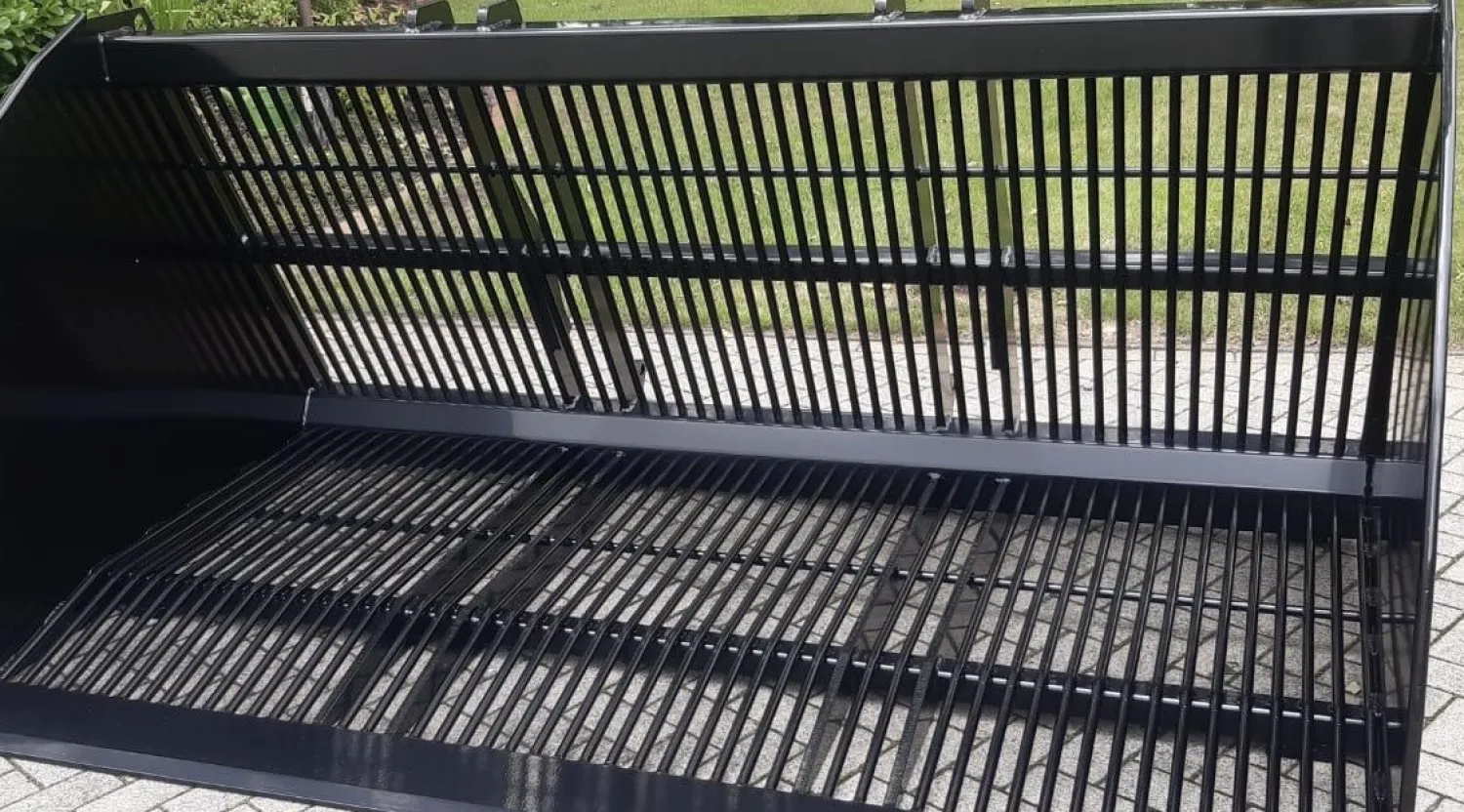 Siebschaufel mit Euroaufnahme ca. 2,40 m Arbeitsbreite, Rundstahl an Schneide verbaut, Schräge vorne an den Stegen zur besseren Sandabfuhr, ca. 2,7 cm Abstand zwischen den Stegen, abgerundete Seitenwände, Tiefe ca. 1,4 m. Baujahr 2025 3.450€ netto