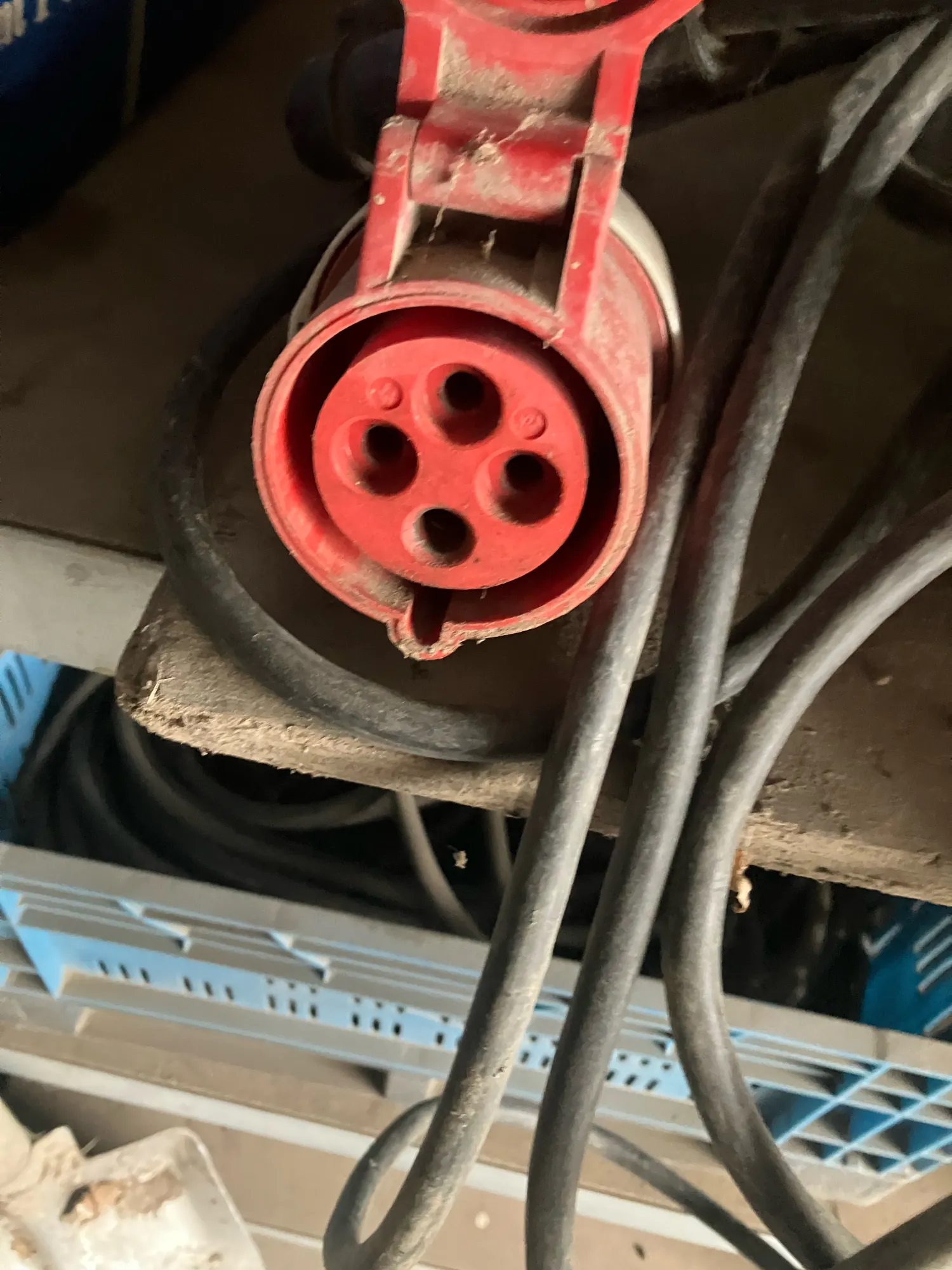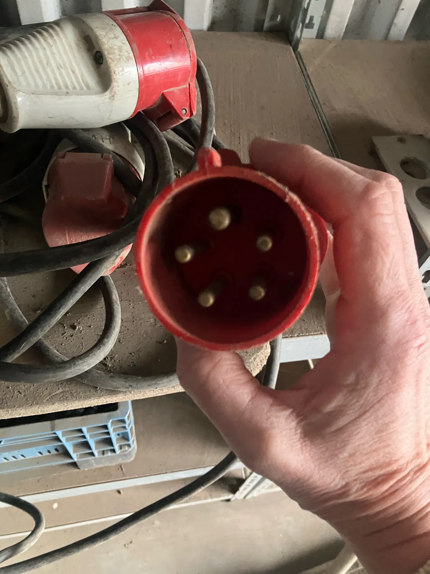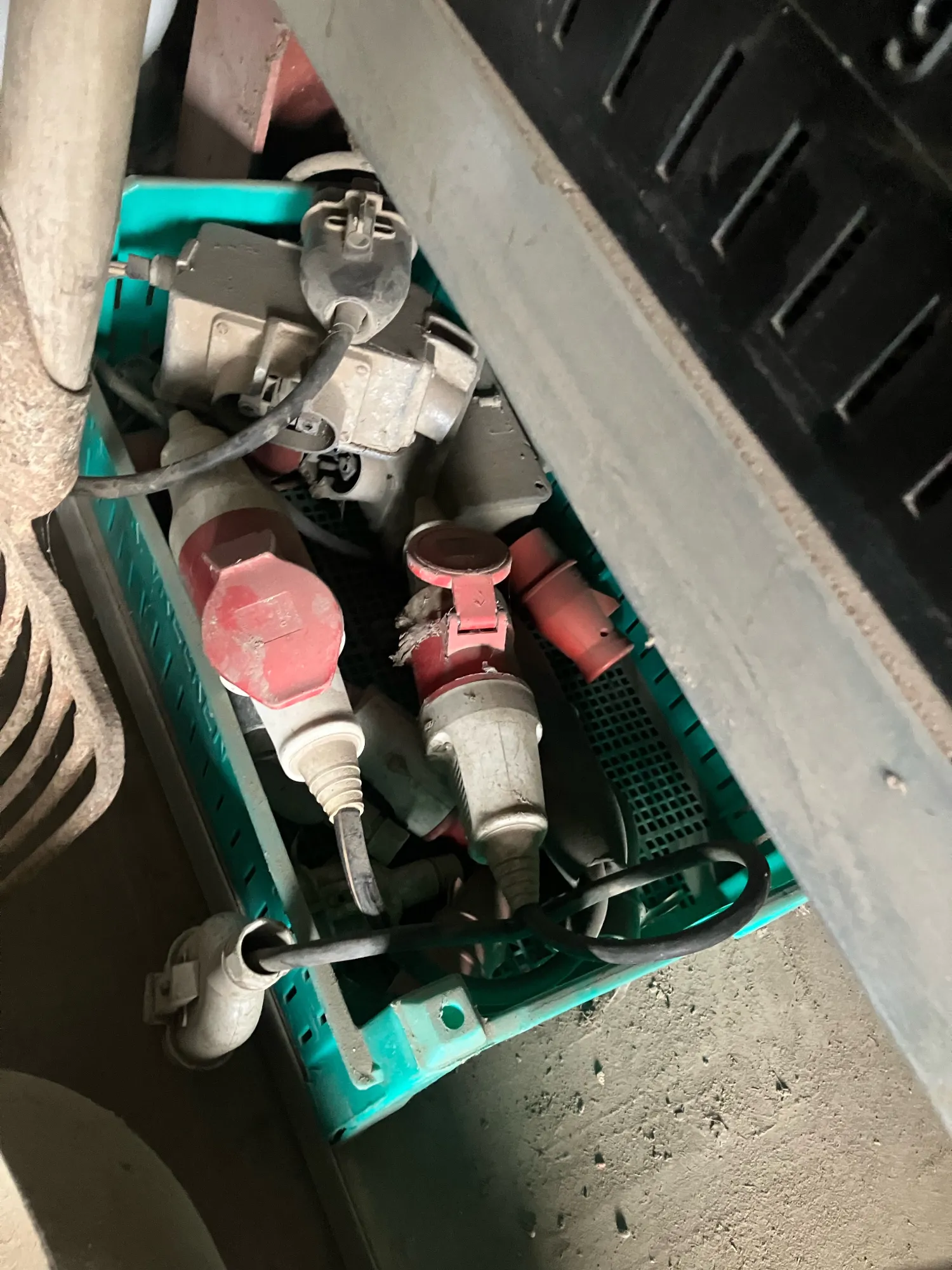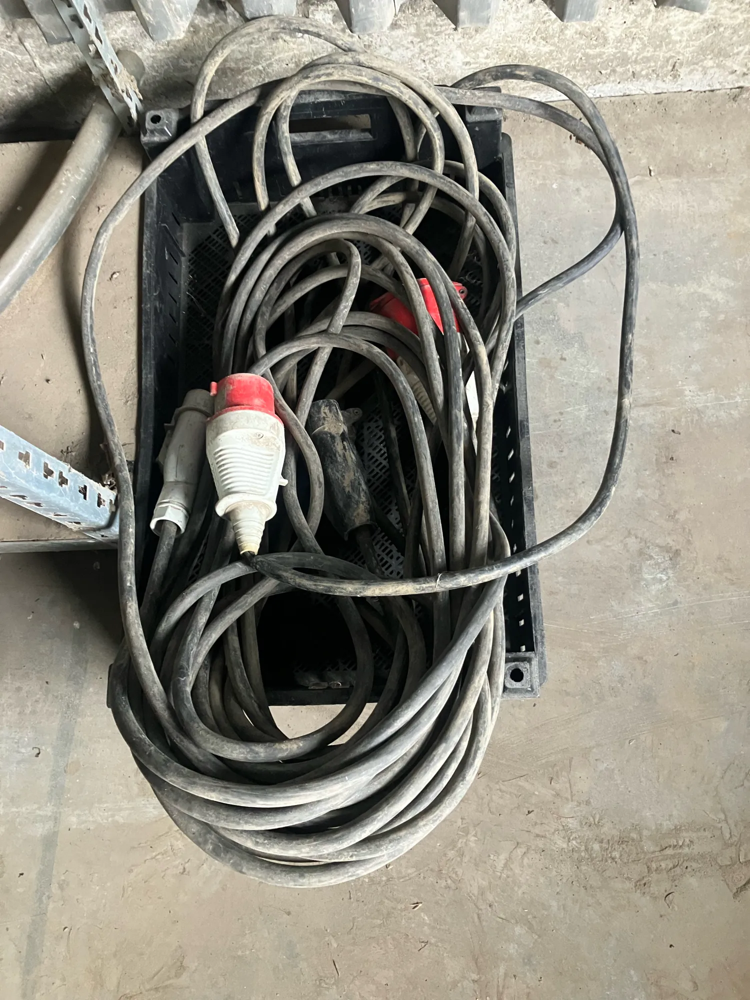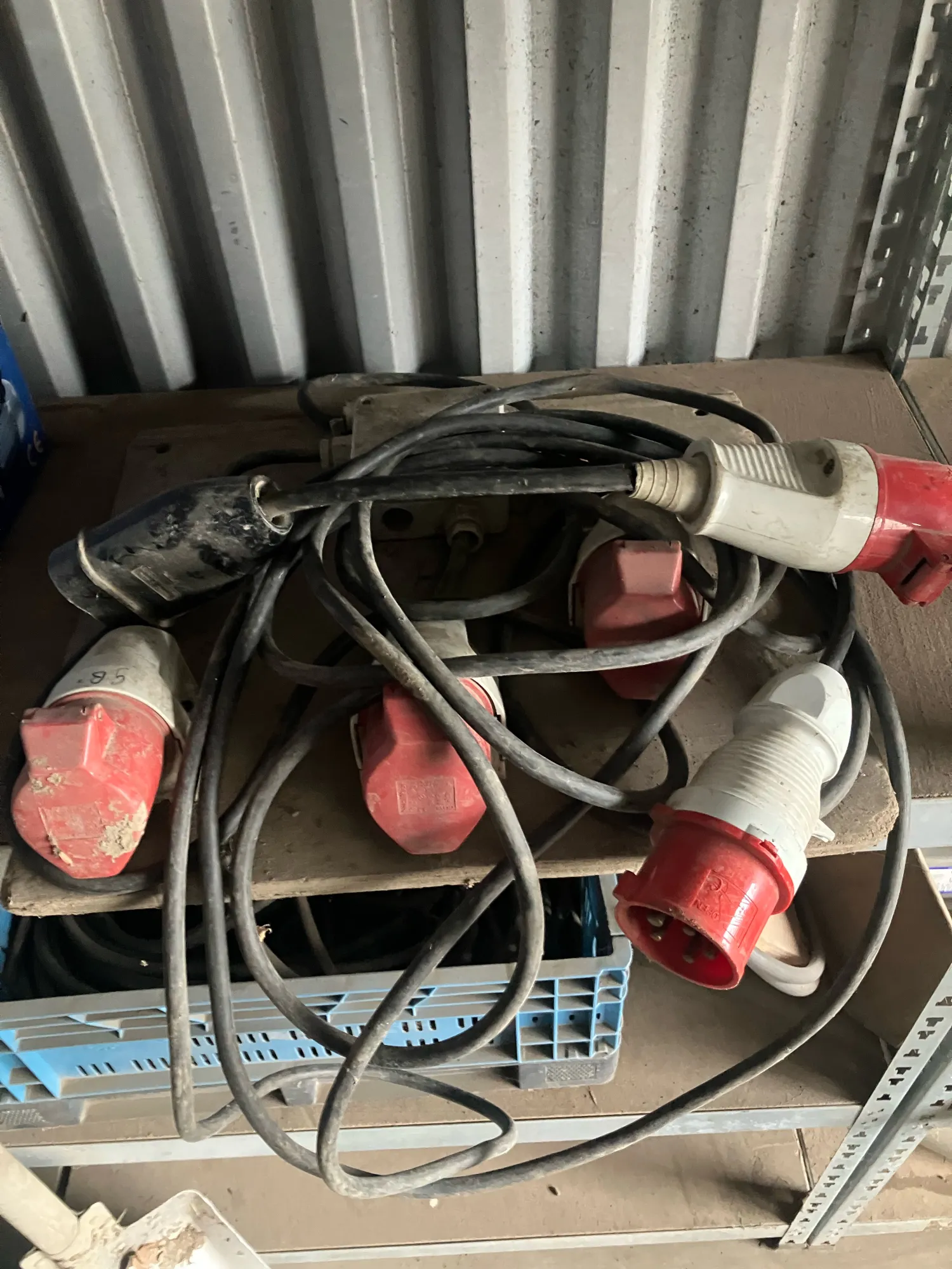 Partij krachtstroom verlengsnoeren en verdeelblokken. Zowel plat als rond, 4 en 5 polig. €100 ex btw af NOP