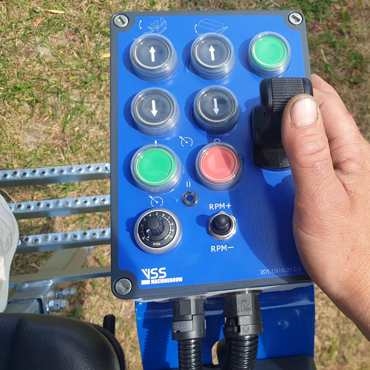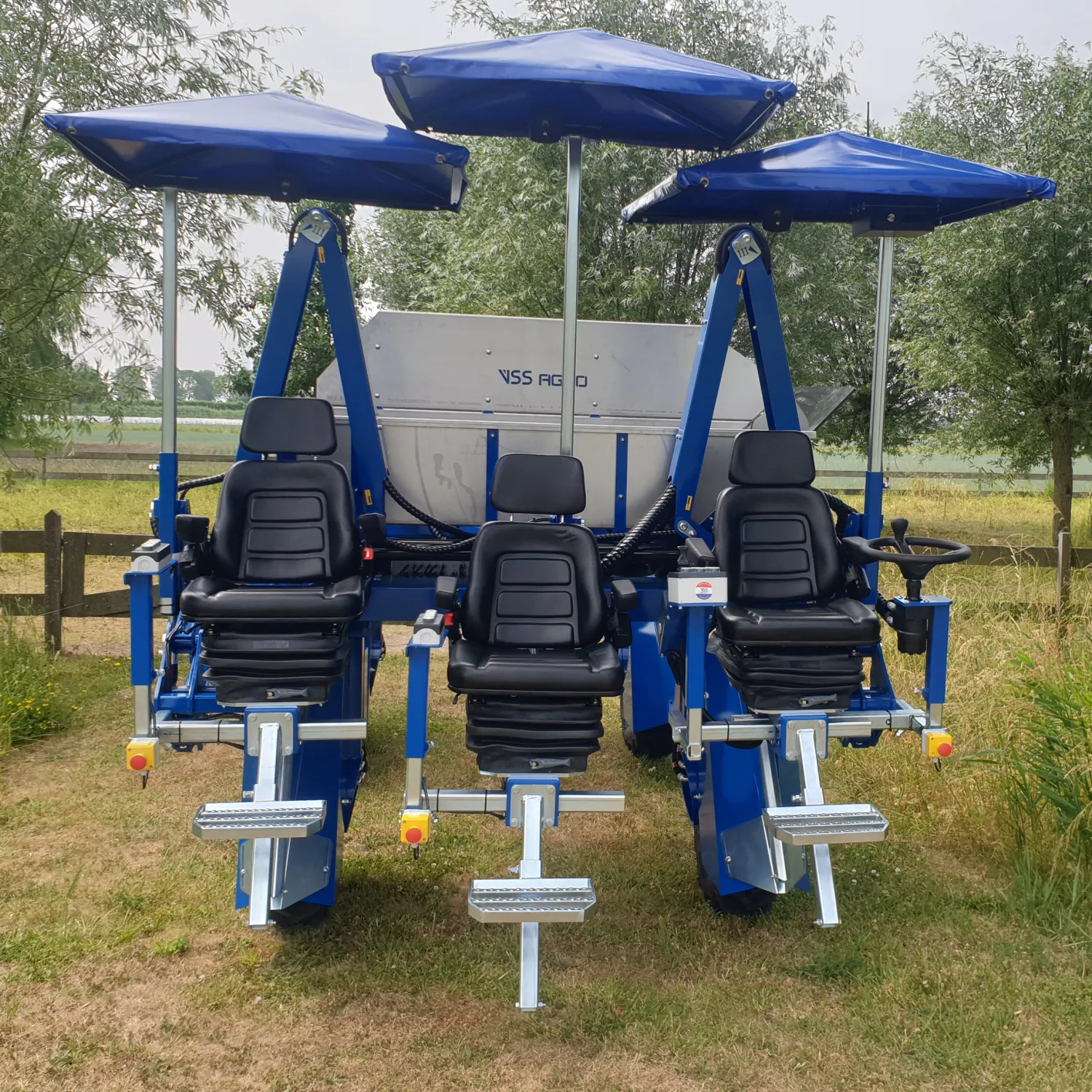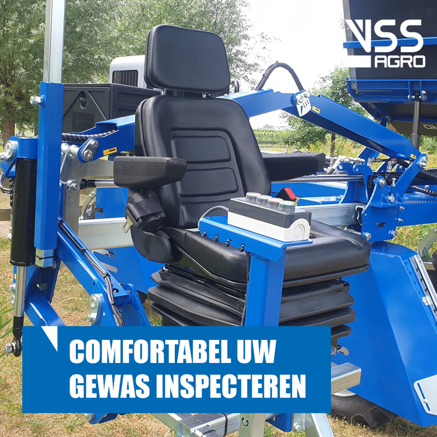 VSS AGRO SELECTIEWAGEN: COMFORTABEL EN GELUIDSARM AARDAPPELGEWAS INSPECTEREN De vierwielige VSS Agro Selectiewagen is ontwikkeld om rijdend het aardappelgewas visueel te inspecteren. Zo kunt u op comfortabele en geluidsarme manier door het aardappelveld rijden om de afwijkende planten op te zoeken. Ideaal voor grote percelen óf als personeel schaars is. Inbegrepen: - 25 PK geluids- en emissiearme dieselmotor, elektr. gestart - Motor voorzien van geluiddempende uitlaat - Spoor 1,5m ( 2x rij 75cm) of 1,8m (2x rij 90cm) - 60L Brandstoftank - Hydr. aangedreven op 4 wielen - 2 hydr. in hoogte verstelbare stoelen - Bedienersstoel (l) met stuurwiel en rijhendel - Alle functies elektr. bedienbaar vanaf linkse bedienersstoel - Werkbreedte: 1,5 - 6m - Werksnelheid: 0 - 12 km/h Opties mogelijk: - 3e stoel - Luxe stoelen - Elektronische bediening, cruise control - GPS snelheid - Brandstofindicator - Loofgeleiders - Zonnekappen - Radiaalbanden - Afsluitbare opbergbak - Radio - Transportbok
