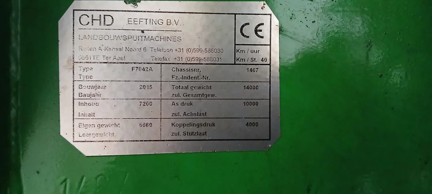 CHD Eefting Pflanzenschutzspritze Baujahr 2015 42 Meter 15 Teilbreiten zusätzliche manuelle Teilbreitenbox Klappbar auf 27 Meter 7200 Liter Behälter 650 Liter Frischwassertank Müller Touch Müller Multifunktionsgriff Section Control Distance Control mit 4 Sensoren Rückfahrkamera LS Anschlüsse Düsenluftabschaltung Airtec Anlage (müsste wieder aufgebaut werden) Elektrische Weitwurfdüse zus. Anschluss zum Ansaugen von Flüssigdünger Spritzen und Strassentüv noch aktuell Bereifung neuwertig Jobrechner ist in 2025 gewechselt worden, Gesamtfläche demnach etwa 35.000 Hektar 47.500€ netto VHB Verfügbar zum Frühjahr 2026