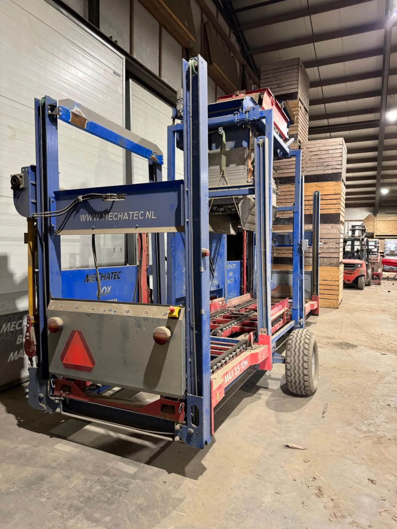 Mechatec Vario Fill Flow Master Inclusief transport trailer Verkoopprijs: €12.500 Automatische kistenvuller Afstapelen Opstapelen