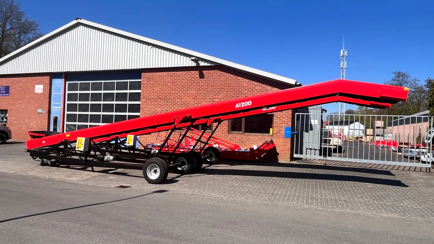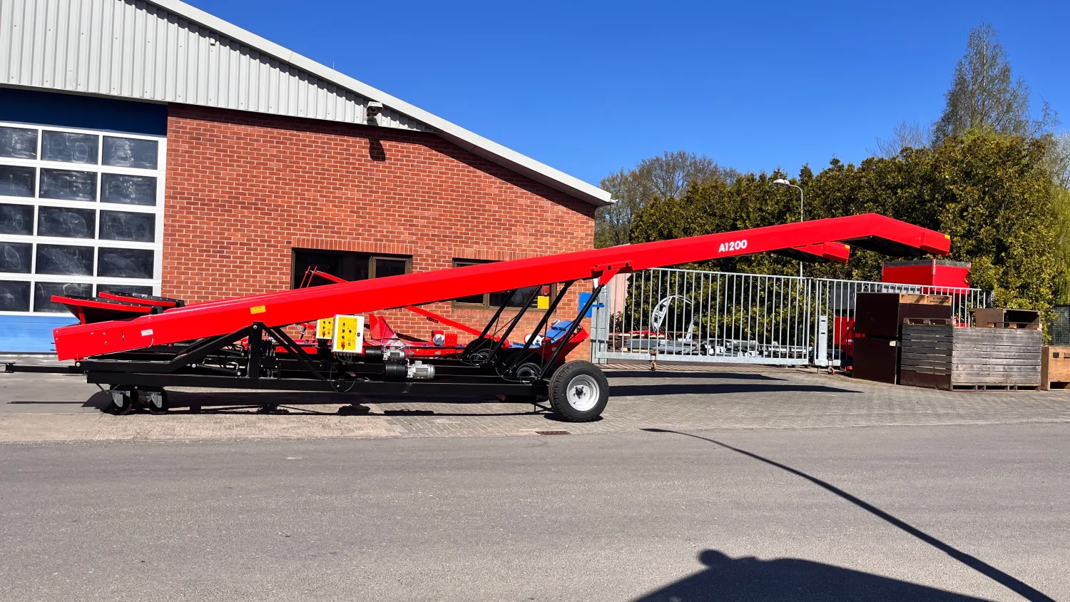 Mechatec A1000 800 mm Brede opvoerband 10,5 mtr bandlengte Electrisch hydraulisch heffen Aanname hydraulisch in hoogte verstelbaar tot 1.15 mtr Max hoogte 4.85 Chevronband met frequentieregelaar Lijn control (relaiscontact on/of). Dissel. 1 seizoen gebruikt, in top conditie