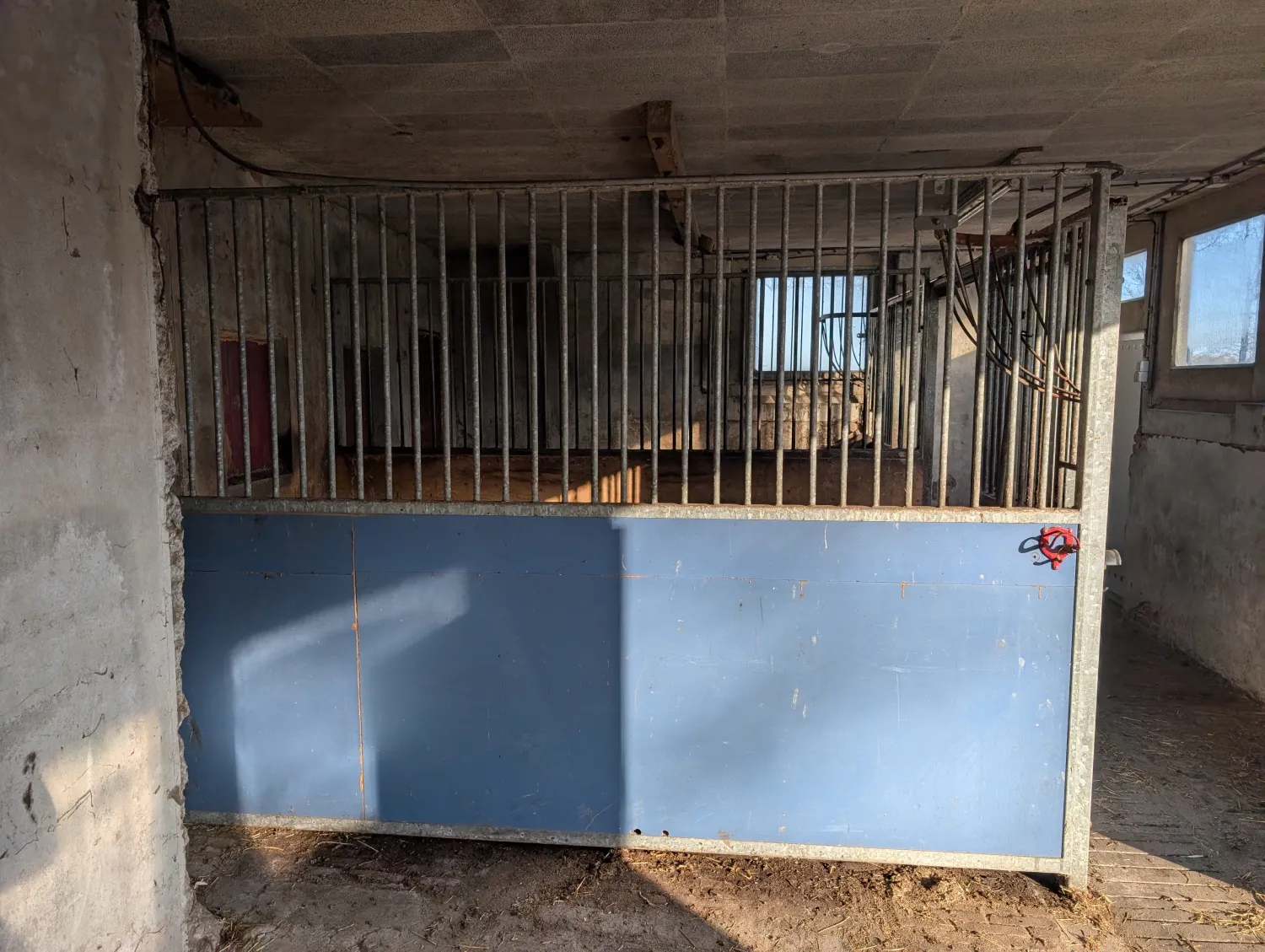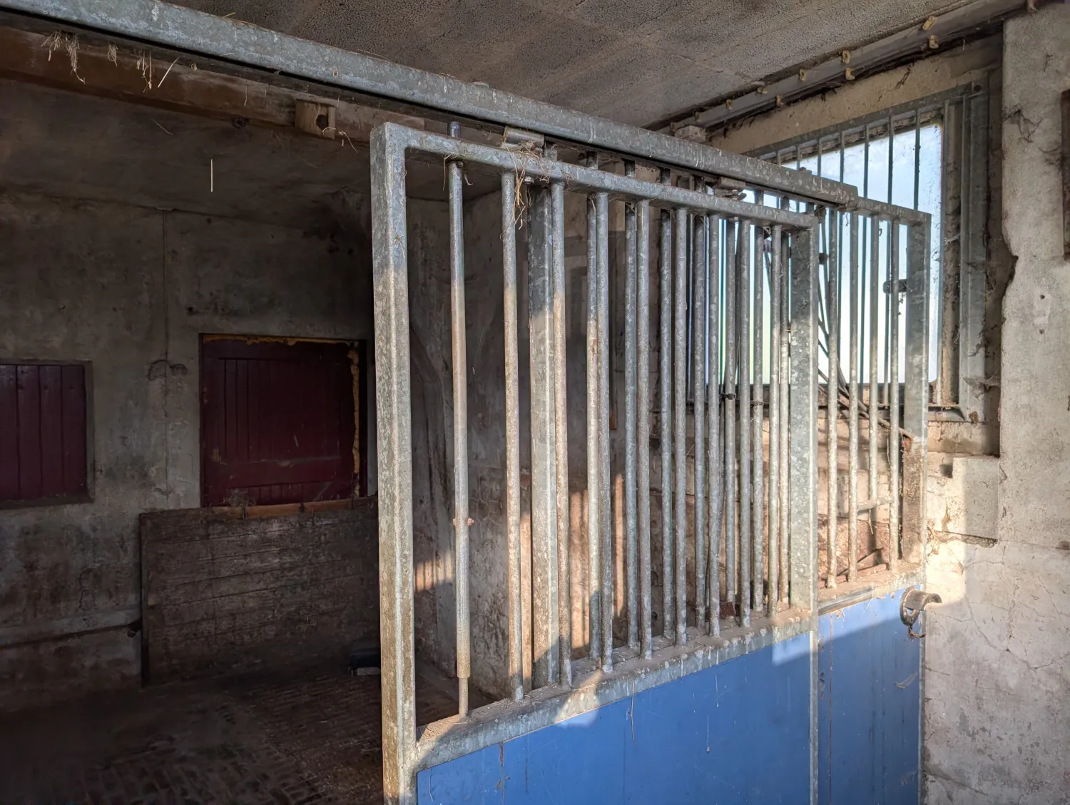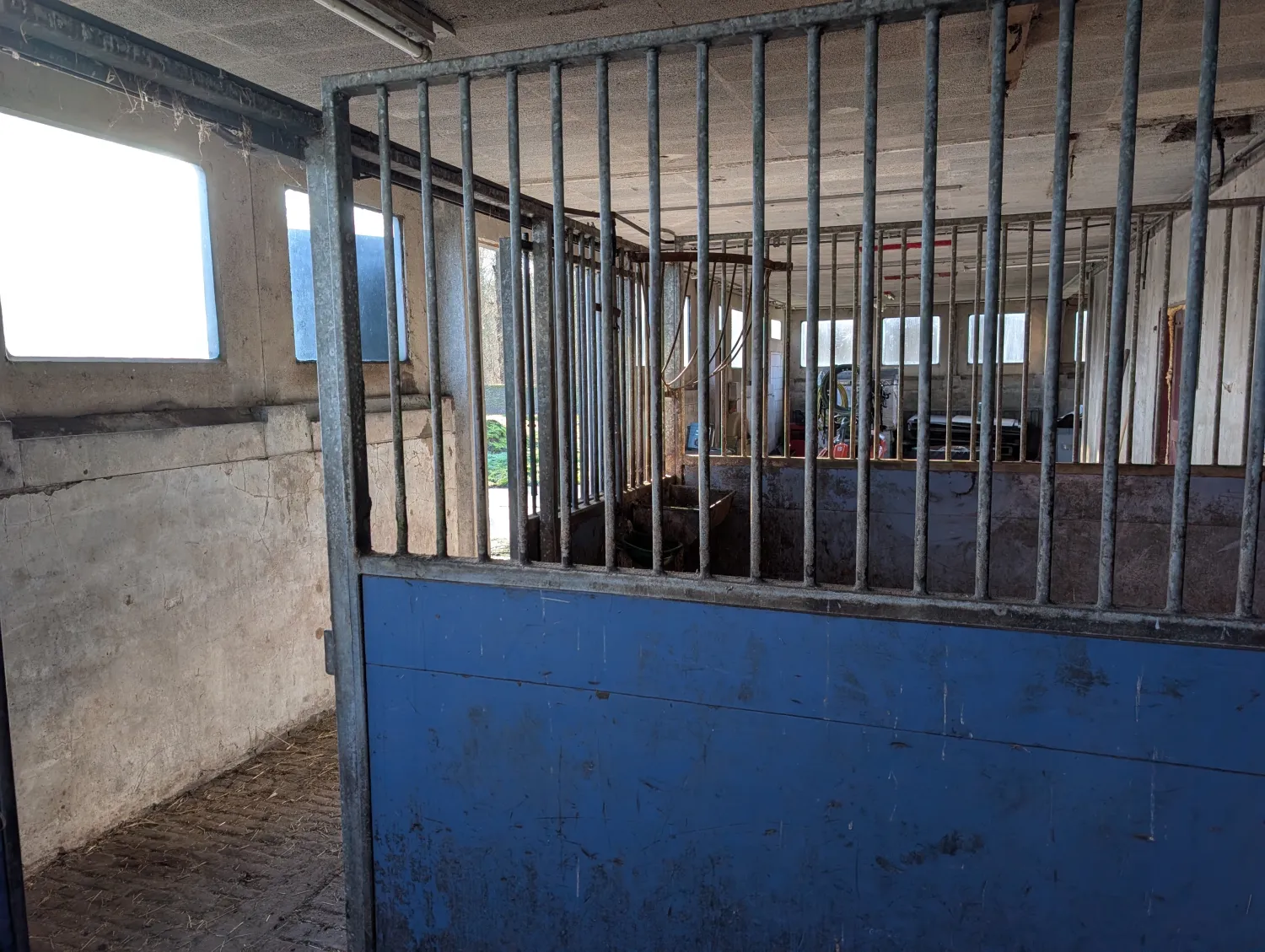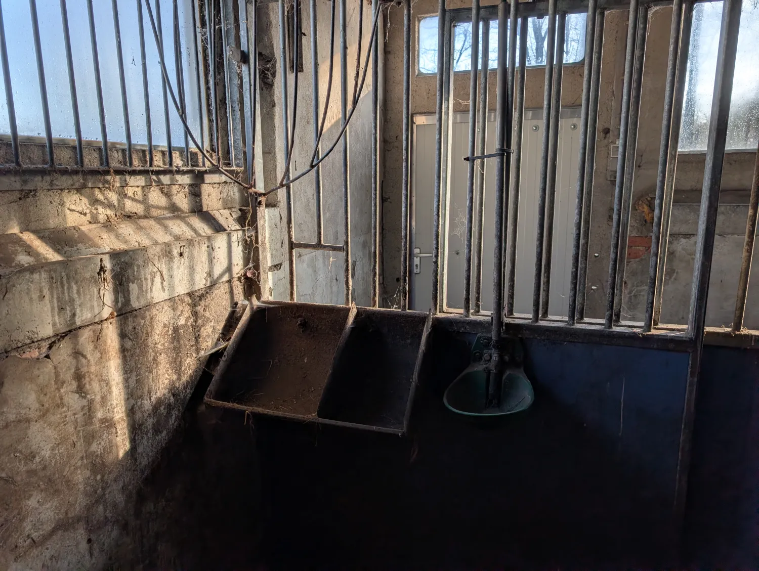 Twee complete paardenboxen, geheel verzinkt. Afmetingen 2 boxen van 2,5 bij 3.6 meter. Totale afmeting dus 5 bij 3.6. Bestaande uit twee zijwanden en 1 voorwand met twee deuren. Ook zijn er meerdere tralie rekken voor bescherming van de ruiten. Compleet met ruifen, drinkbakken en voerbakken. Prijs notk