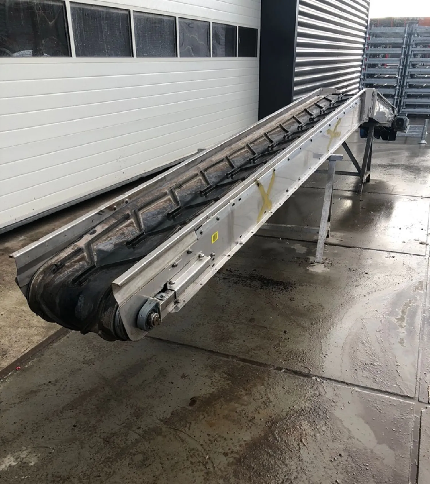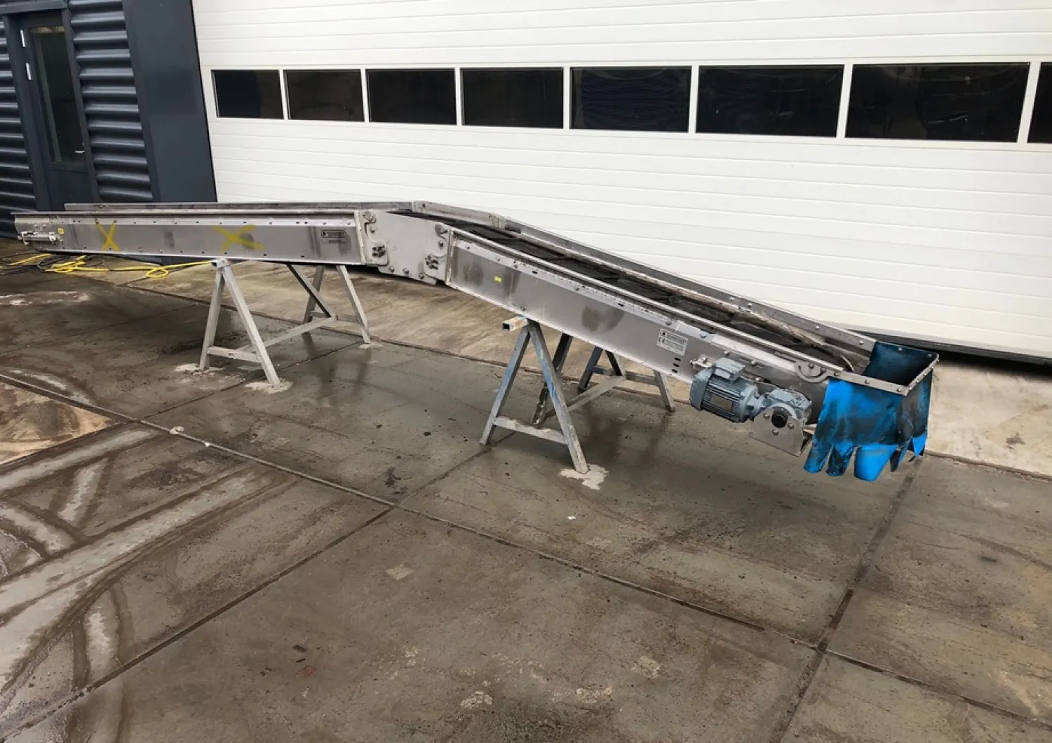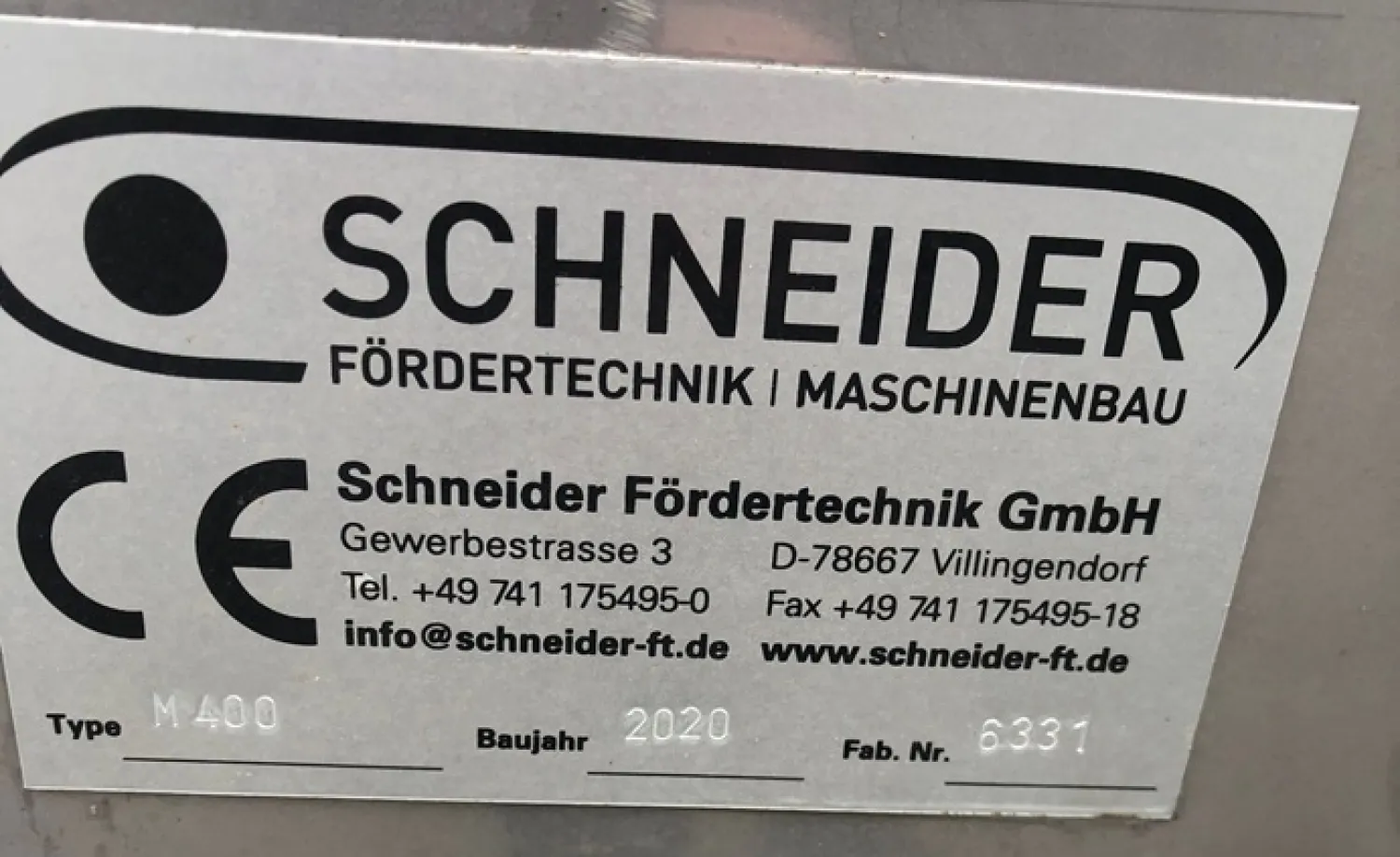 Nette Schneider Stainless Steel Conveyor The angle of the conveyor is adjustable. Type: M400 Year of Manufacture: 2020 Dimensions: 6700 x 400 mm Flight Height: 15 mm Plug-on Motor: Power: 1.1 kW Current: 2.55 A
