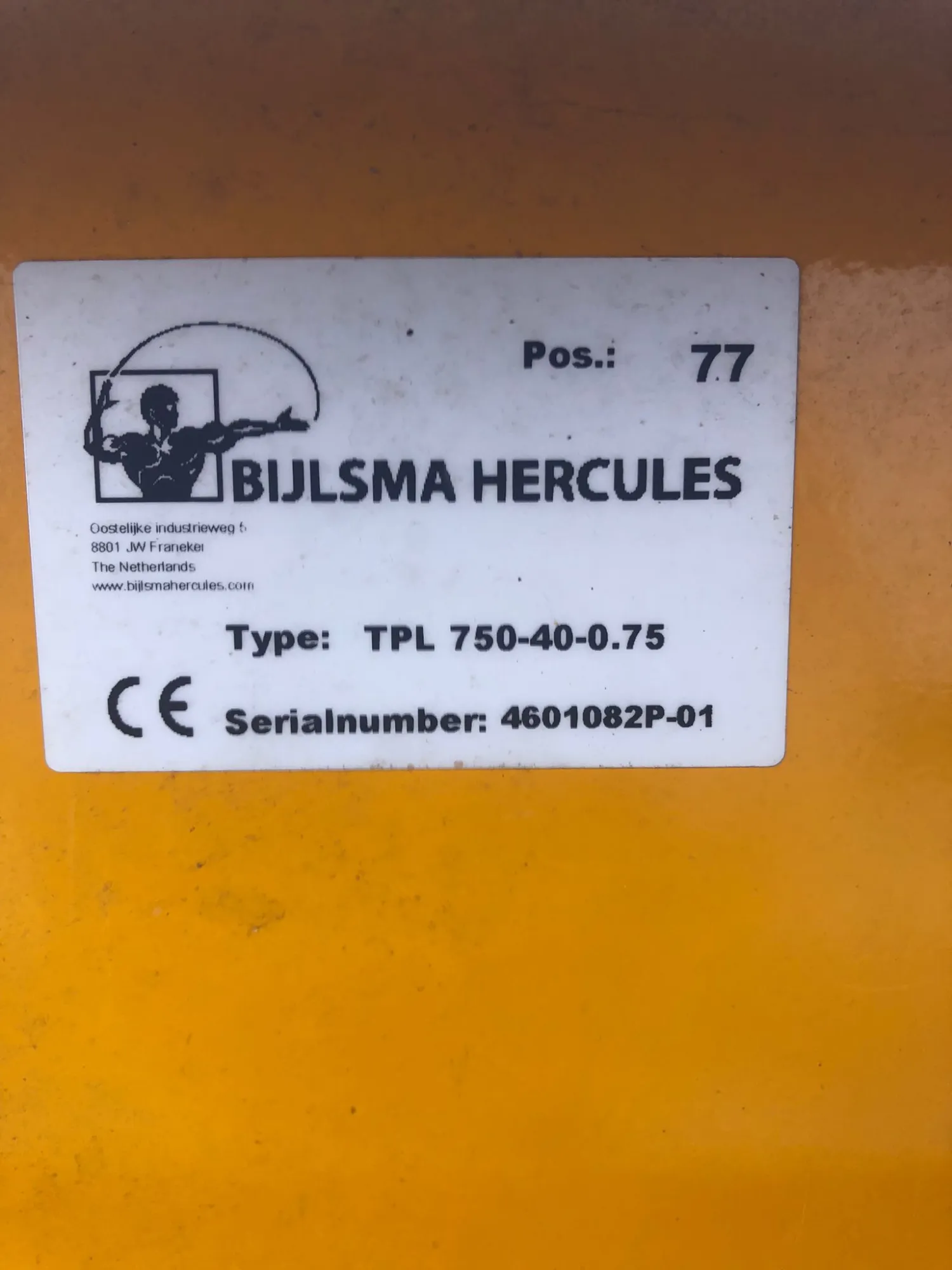 Well-maintained used Bijlsma Hercules conveyor belt. Dimensions: 7480 x 395 mm Conveyor belt material: PVC Drive motor: 0.55kW 1.6A Type number: TPL 750-40-0.75 Serial number: 4601082P-01